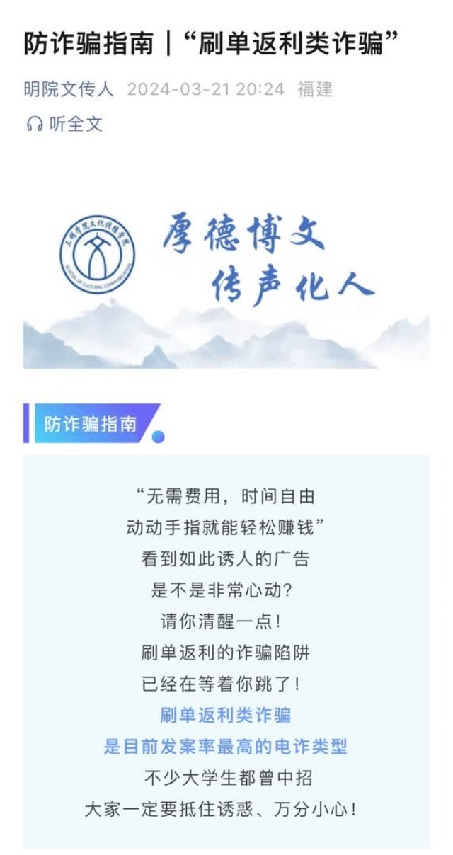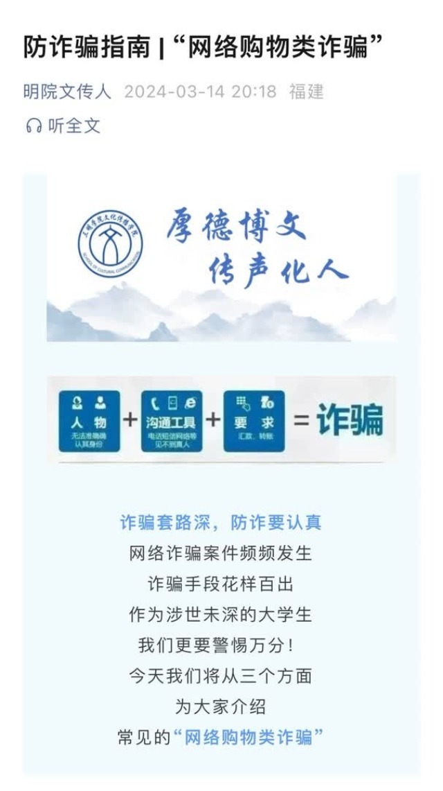 为提升广大学生防范电信网络诈骗的意识和能力,切实维护学生人身财产安全和校园安全稳定,近期,文化传播学院开展防范电信网络诈骗专题教育系列活动。