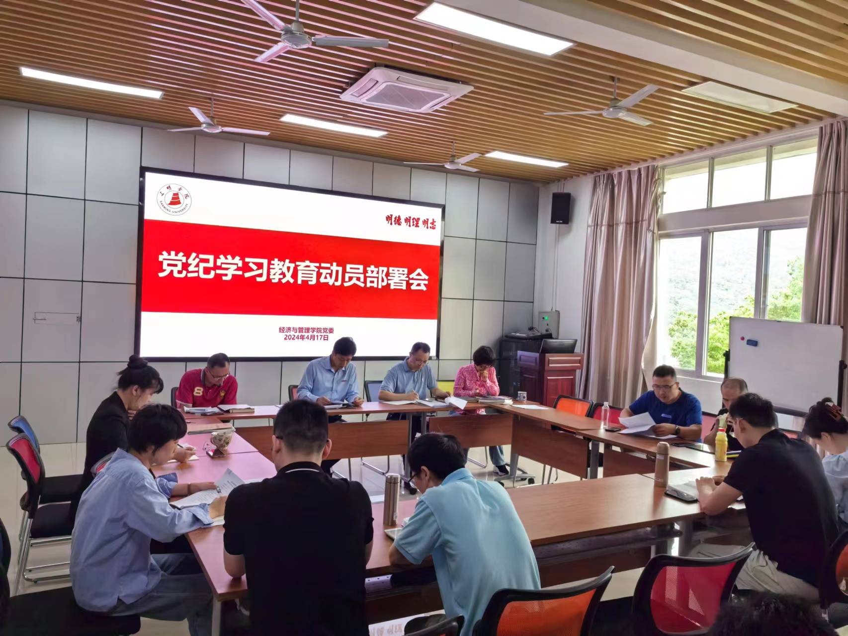 4月17日上午,经济与管理学院党委召开党纪学习教育动员部署会,集中学习《中国共产党纪律处分条例》和中共中央办公厅《关于在全党开展党纪学习教育的通知》,学习传达《yl6809永利官网党纪学习教育工作方案》,专题部署党纪学习教育工作。
