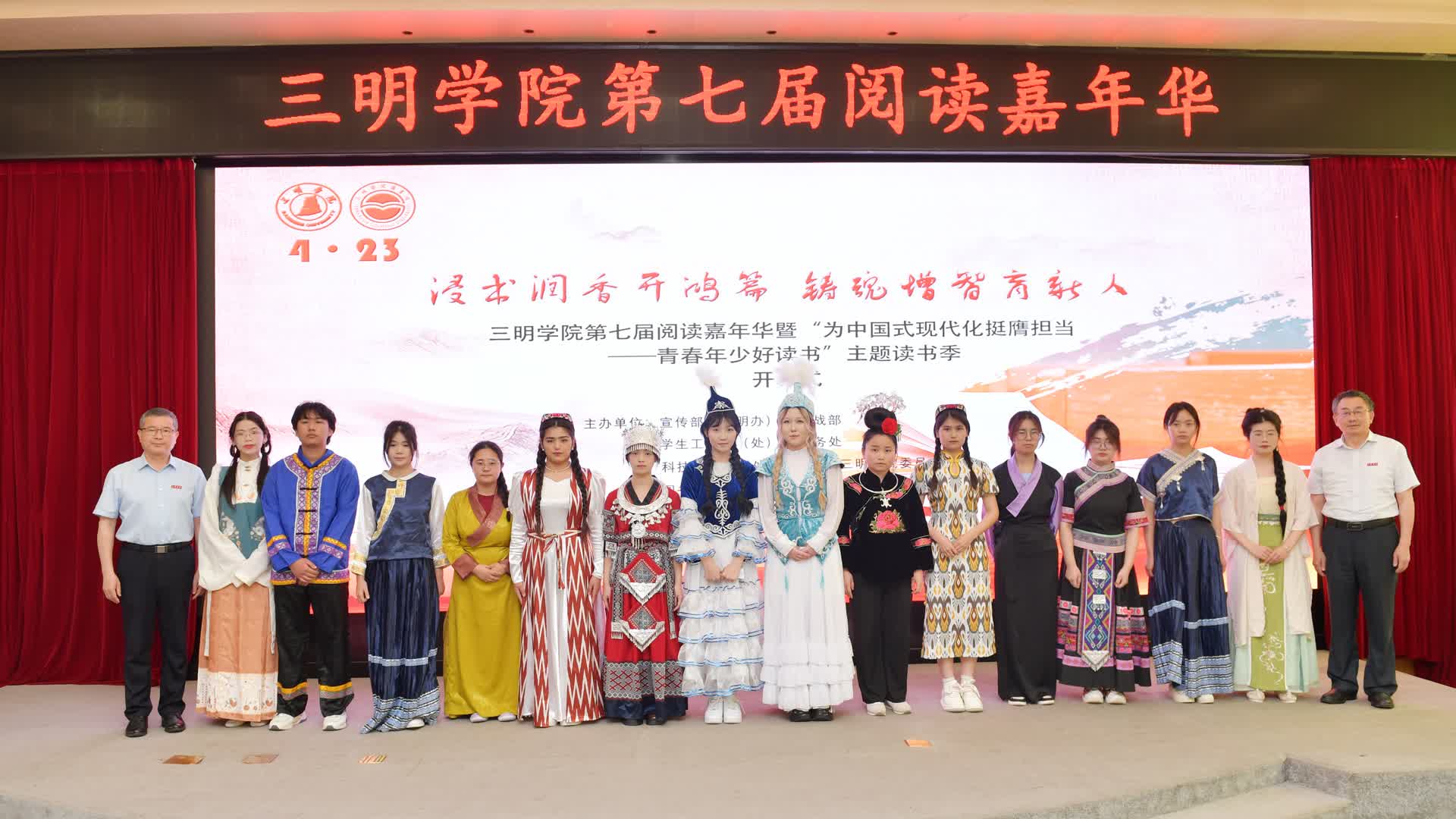 开幕式上,民族学生代表发出读书倡议,赖锦隆书记和林建伟副校长与民族学生代表亲切合影。校第七届“谁是最佳朗读者”大赛获奖代表为现场观众诵读作品《百年交响》《不朽》。