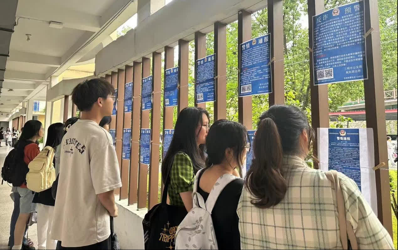 一份份警情通报吸引了来往学生的注意,醒目的文字无声地诉说着电信诈骗的真相,触目惊心的数字显示了电信诈骗的危害,学生们纷纷驻足观看,深感警醒。