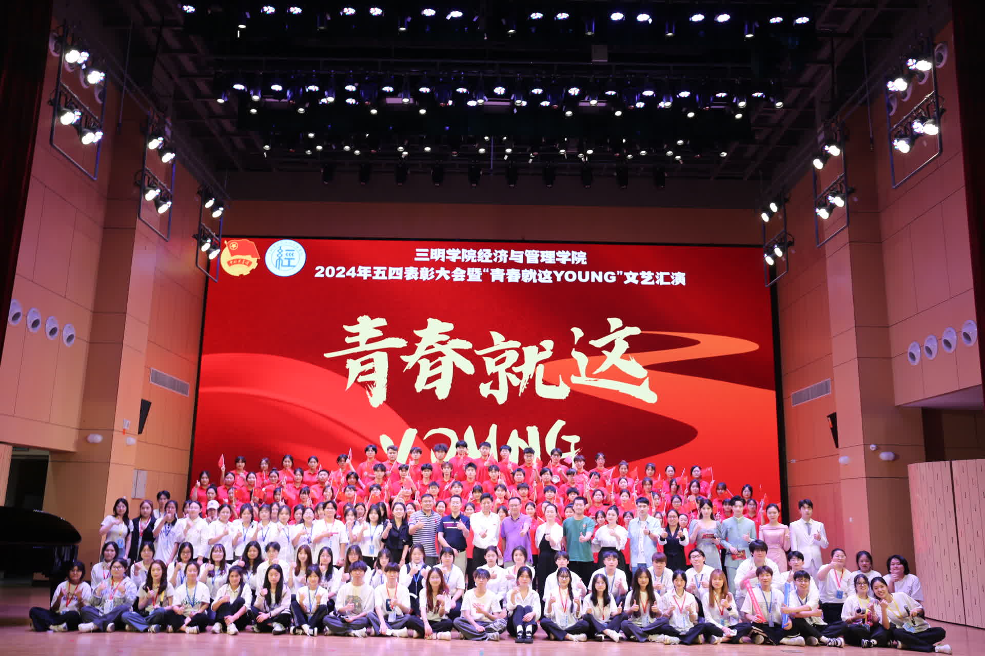 为弘扬五四精神,激发青年学子的创造力与奉献精神,推进新时代铸魂育人工作,5月15日晚,经济与管理学院在艺术楼音乐厅举办了“青春就这young”的五四表彰晚会。学生处刘欢副处长,经济与管理学院党委叶志鹏书记、林嵘副书记,张桂梅、李想副院长,院优秀校友代表、校工商业校友会黄欣荣会长、裴志雄副会长一行以及学院老师和学生代表400多人共同参与了此次盛会。