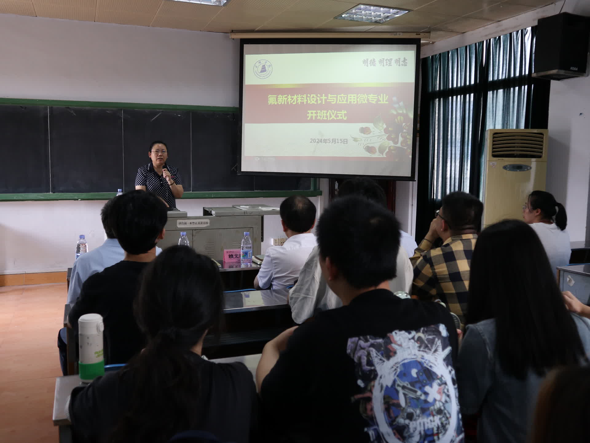 微专业为学生提供了跨学科交叉融合的学习机会,满足了个性化发展需求,标志着学校在教育教学领域迈出了新的一步。开班仪式后,肖旺钏教授以“氟新材料设计与应用”为题为微专业学生授第一堂课。