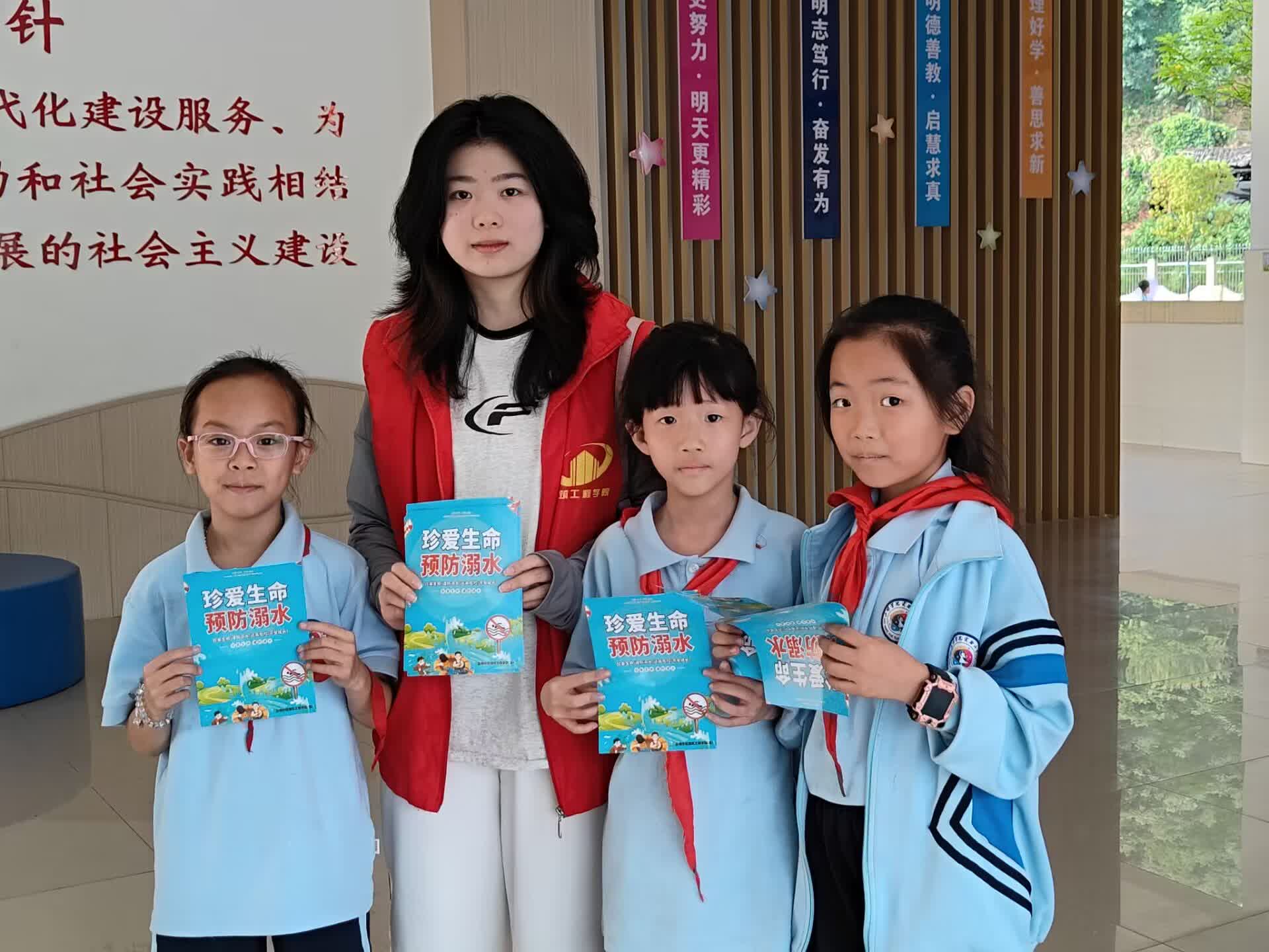志愿者在yl6809永利官网附属小学校门口、操场、走廊等人流密集区域,开展水上安全知识宣传活动,并在宣传中耐心指导孩子们在溺水时如何进行有效自救以及如何在确保自身安全前提下救助他人。