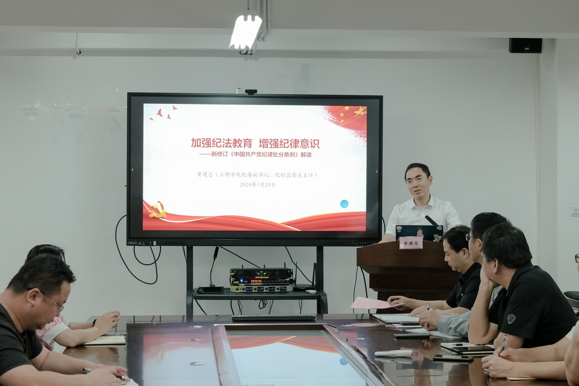 为加深党纪理解和加强党纪学习教育,5月29日下午,信息工程学院邀请校纪委副书记、纪检监察室主任黄建总在知新楼1416会议室作党纪学习教育专题辅导报告,全体师生党员参加。