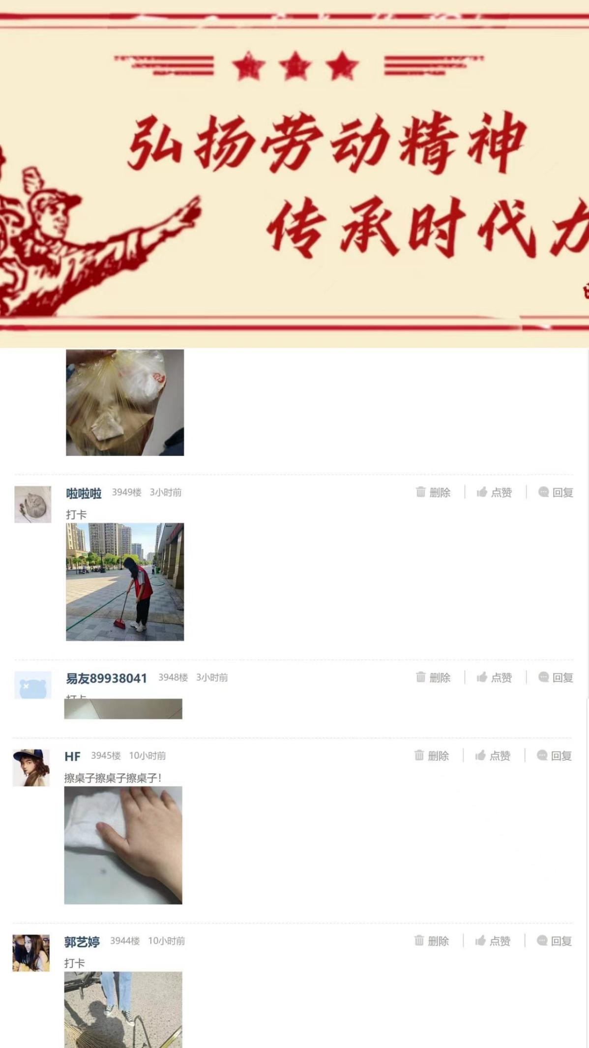 “伟大的灵魂,常寓于平凡的躯体。”许许多多无怨无悔、倾情奉献的无名英雄,在平凡岗位上铸就生命的精彩华章。在易班轻应用快搭发起的“30天劳动积分打卡”活动中,3601人次积极参与话题讨论并分享日常劳动内容。或拿起手中劳动工具积极打扫教学楼周边,将地上片片落叶扫起;或拿起锄头展现在田地里辛勤耕作的场景。见此景,22汉语言文学(师)巫小凡深有感触,“此次系列劳动教育活动不仅让我更深入的了解劳动者的辛苦,还让我更加热爱劳动。作为新时代青年我们应当有所想、有所为,坚信劳动创造美好生活,乘劳动之风,为国家发展贡献力量。”