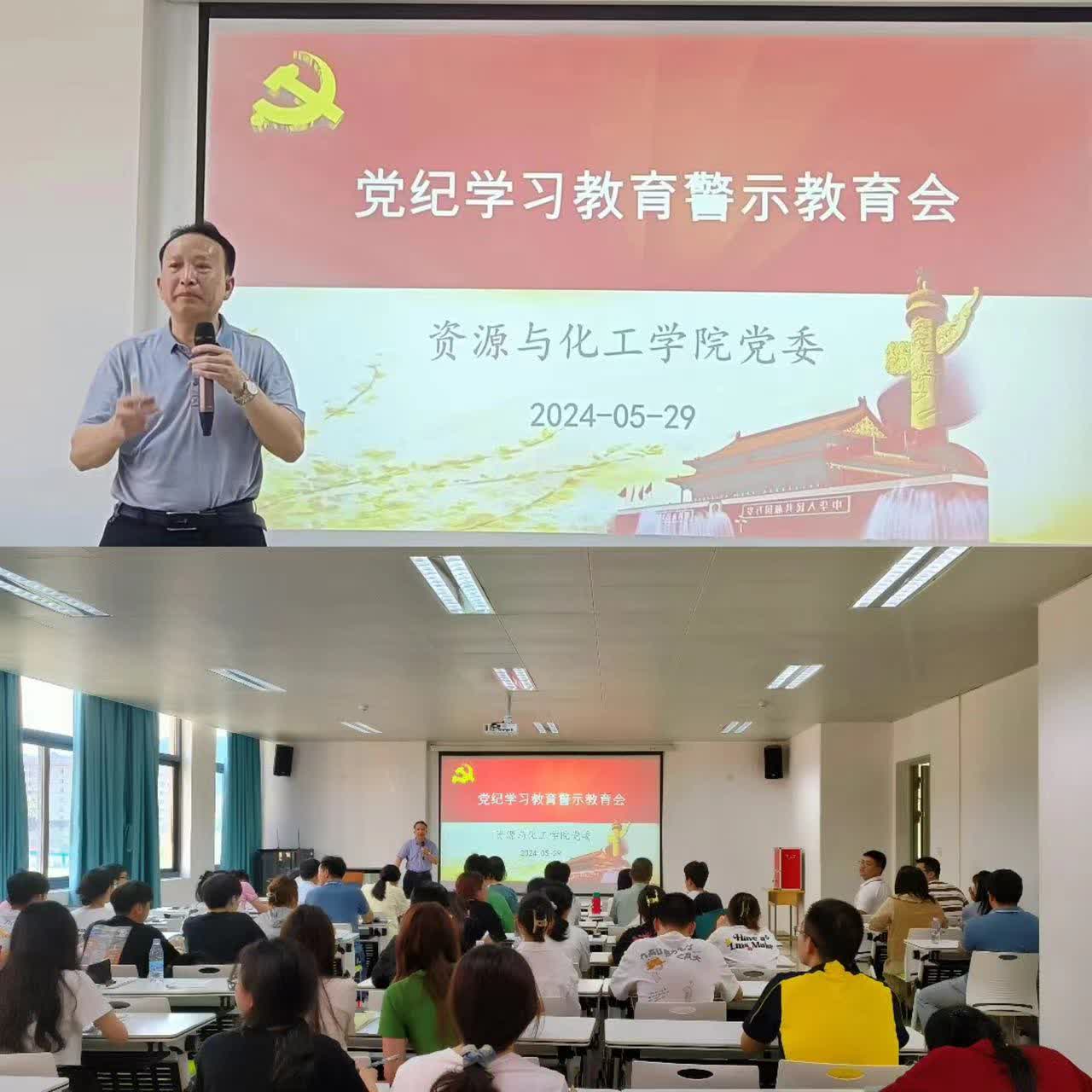 为推动党纪学习教育走深走实,教育引导广大党员干部受警醒、明底线、知敬畏,5月29日,资源与化工学院召开党纪学习教育警示教育大会。学院全体师生党员干部参加,院党委负责人主持会议并讲话。