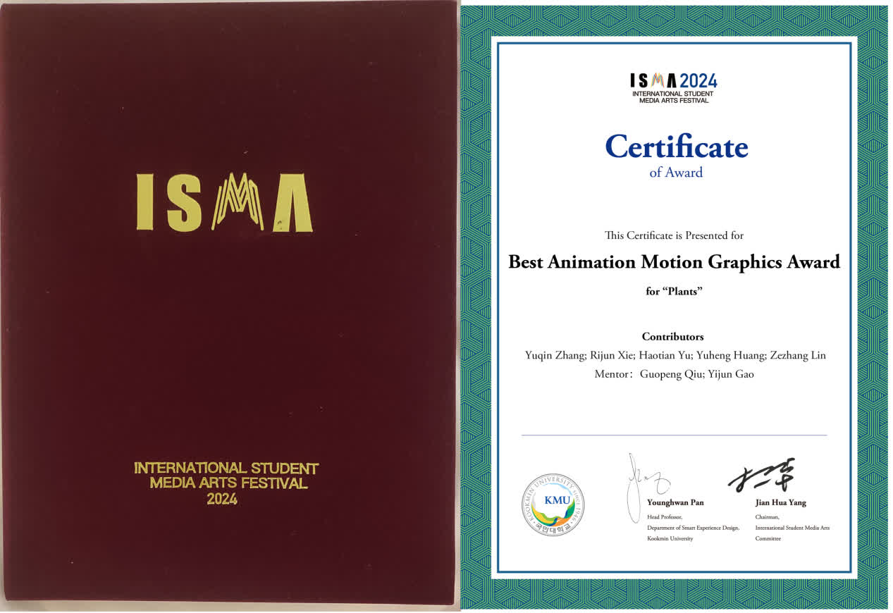 近日,第五届国际大学生媒体艺术节(ISMA)在韩国落幕,yl6809永利官网的代表队在数字媒体动画竞赛单元中荣获“最佳动画运动图形奖”(Best Animation Motion Graphics Award)。