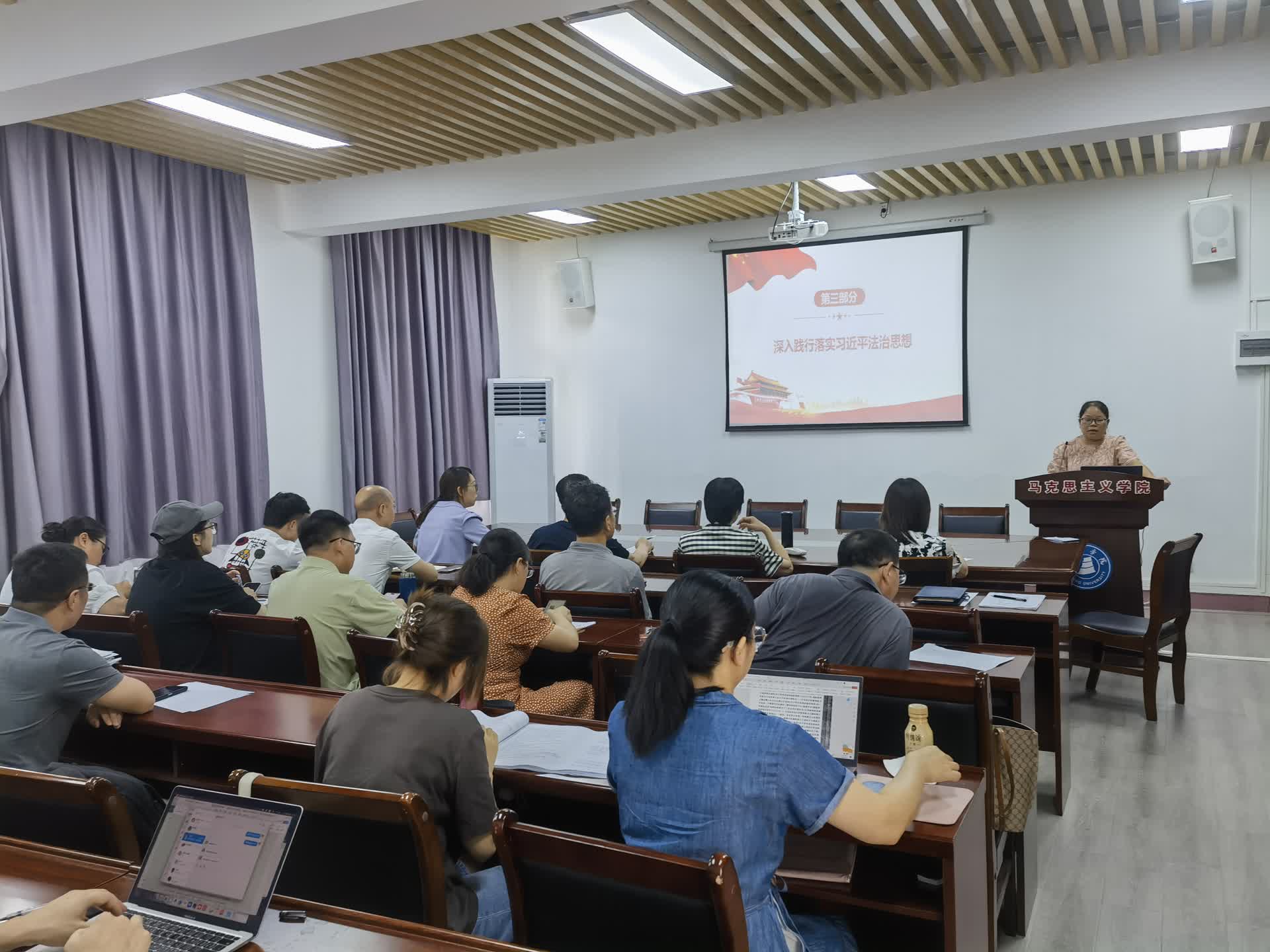 为认真贯彻落实习近平法治思想,加强依法治理,提升全体教职工法治知识,增强法治意识,6月26日,马克思主义学院邀请思想道德与法治教研室主任刘春明副教授作《深入践行落实习近平法治思想》暨党纪学习教育专题辅导报告会。院领导班子,全体教职工参加,会议由院党委书记主持。