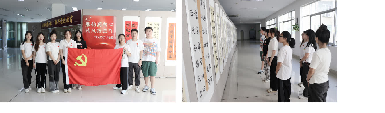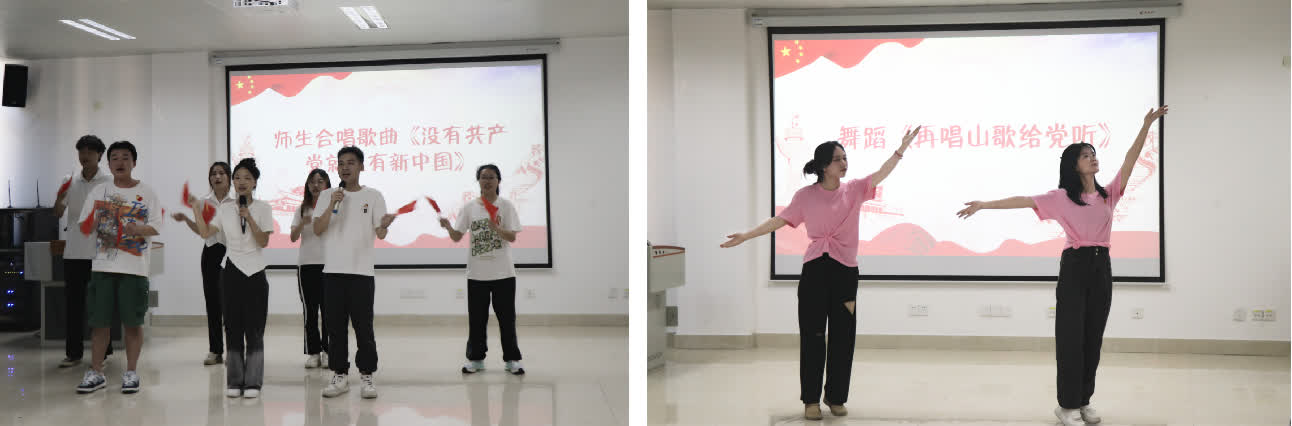 青春向党,歌颂党恩。师生党员合唱歌曲《没有共产党就没有新中国》,表演手势舞《天天向上》以及舞蹈《再唱山歌给党听》,用载歌载舞的方式颂党恩。最后,支部前往图书馆参观“党员说纪”书法展。