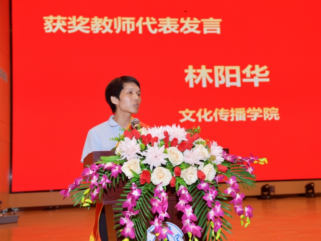 三明市师德标兵、文化传播学院林阳华教授作为获奖教师代表发言。他结合自身经历分享成为一名“好老师”除了需要有崇高的理想信念、道德情操、扎实学识、仁爱之心之外,还需要好的“发现者”,挖掘、宣扬好老师的智慧和才能;好的“引路人”,引导、唤醒好老师的毅力和潜能,好的“风向标”,指引、明确好老师的方向和目标。