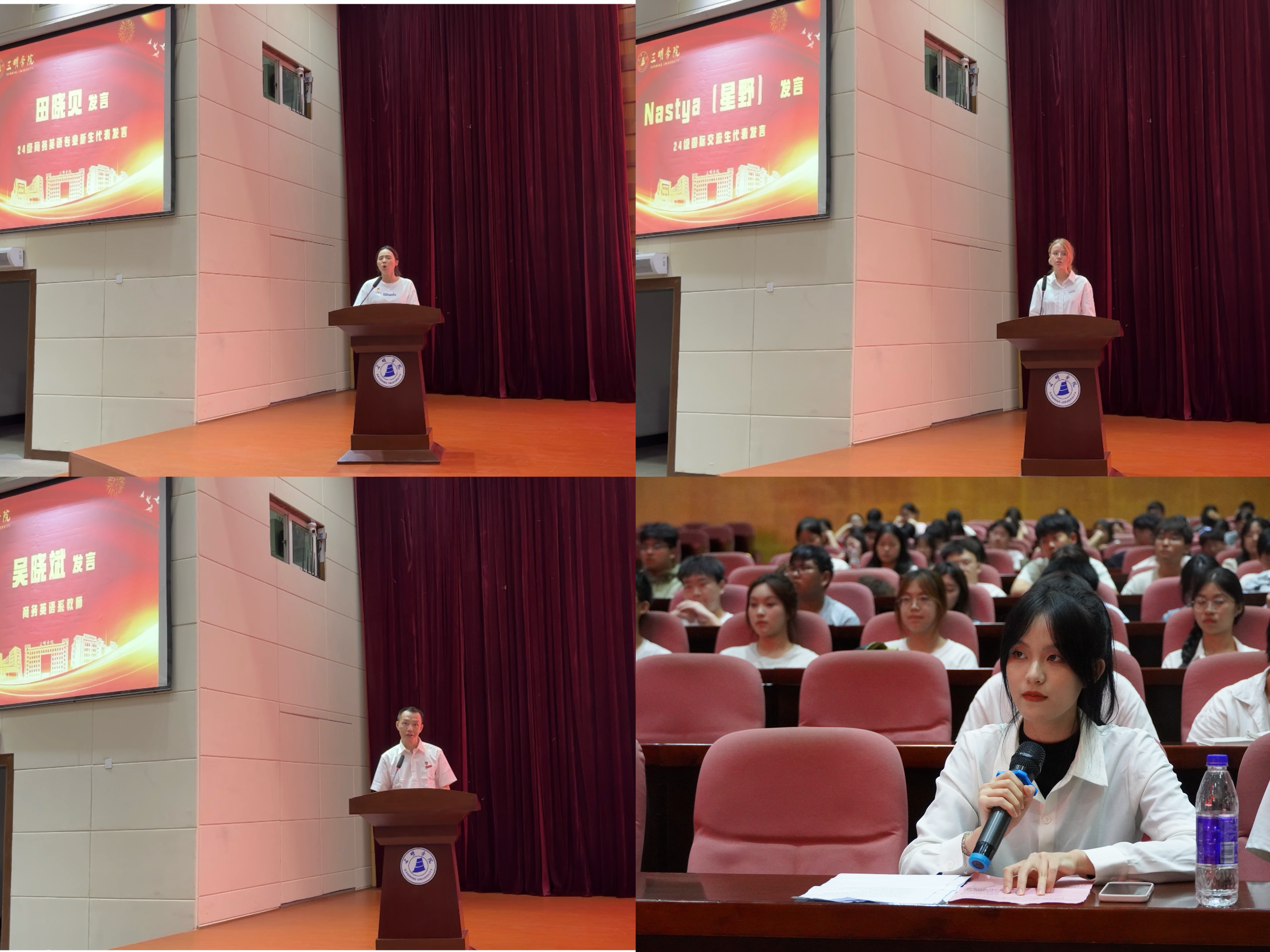 新生代表、国际新生代表、教师代表相继上台发言。2024级商务英语专业田晓贝用流利的英文分享了踏入明院的深切感受,号召广大新生牢记习近平总书记“立大志,明大德,成大才,担大任”的殷切嘱托。来自俄罗斯的国际新生代表Nastya(星野)用俄语、中文、英语向大家热情问候,她表示学校的老师、同学们从乘车、住宿、生活保障等各方面都给予了最好的关怀,她期待着未来在yl6809永利官网的求学之旅会更加丰富多彩。商务英语系教师吴晓斌在发言中鼓励广大新生要“找到热爱,并为之坚持、努力”,交替传译的方式为学生锻炼口译能力提供平台。