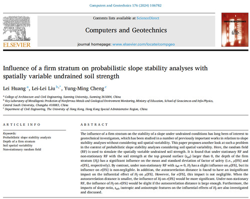 黄磊的研究成果“Influence of a firm stratum on probabilistic slope stability analyses with spatially variable undrained soil strength”,在土体空间变异性和概率分析的背景下讨论了硬层深度对边坡安全评价指标的影响,丰富了边坡风险评估领域的科学发现,为工程实践提供了更多理论依据。