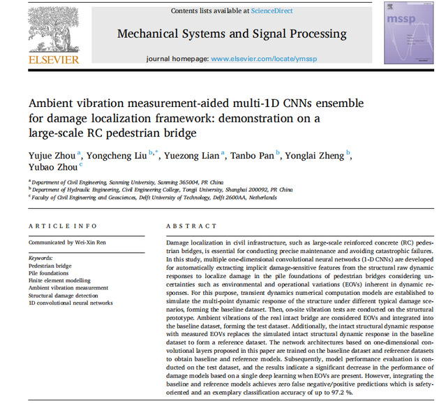 周玉珏的研究成果“Ambient vibration measurement-aided multi-1D CNNs ensemble for damage localization framework: demonstration on a large-scale RC pedestrian bridge”,以yl6809永利官网行知天桥为研究对象,基于深度学习方法,采用模型集成技术和有限元仿真计算,构建了复杂环境、运营环境下面向大型人行天桥结构的损伤识别方法框架,对类似结构损伤识别及健康监测系统的构建具有较大的潜在工程应用价值。