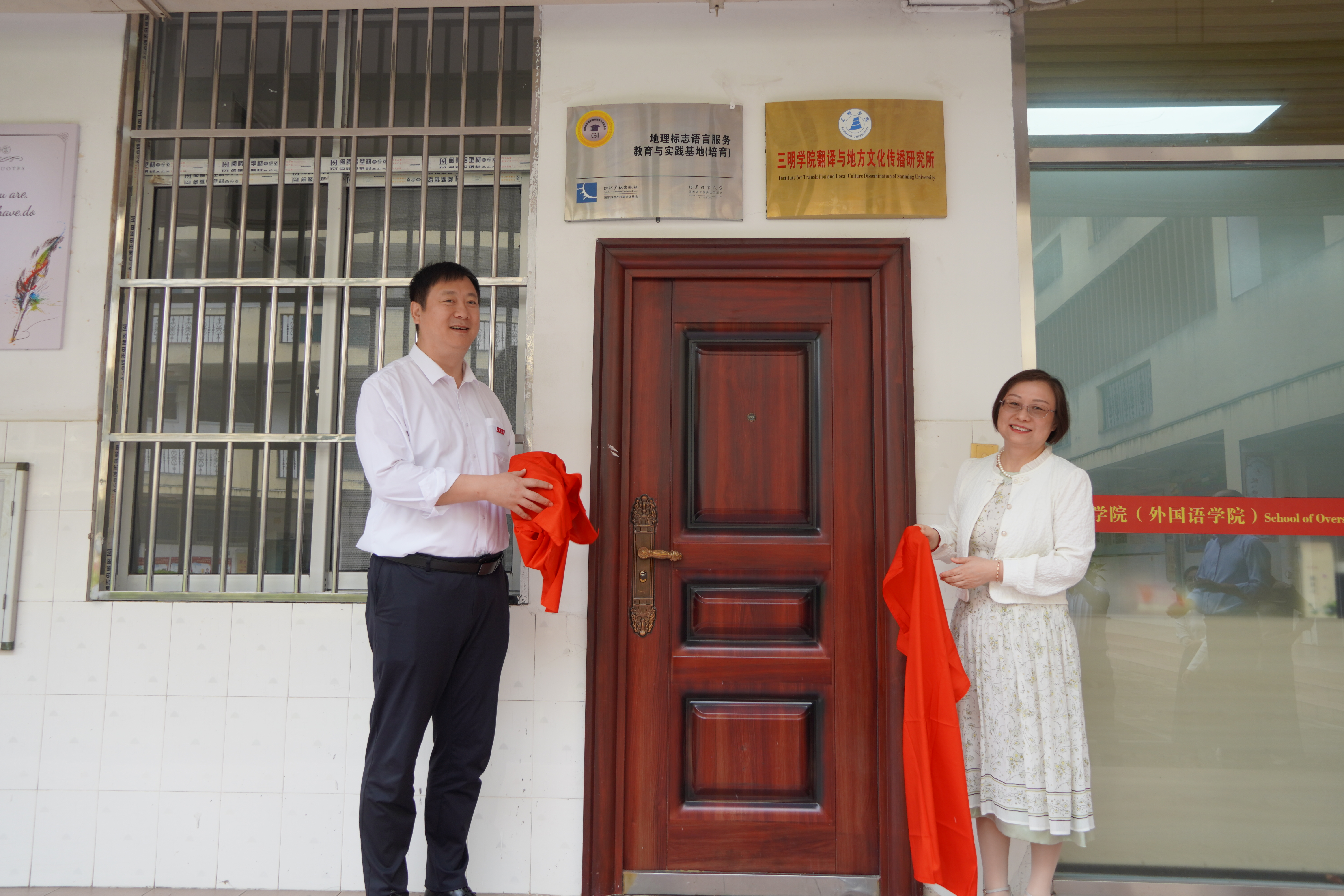 yl6809永利官网海外学院(外国语学院)刘景苗书记向与会专家学者介绍了学院发展历程和沪明合作所取得的成绩,并邀请吴龙副校长和卢敏院长为“yl6809永利官网翻译与地方文化传播研究所”和“地理标志语言服务与实践基地(培育)”揭牌。
