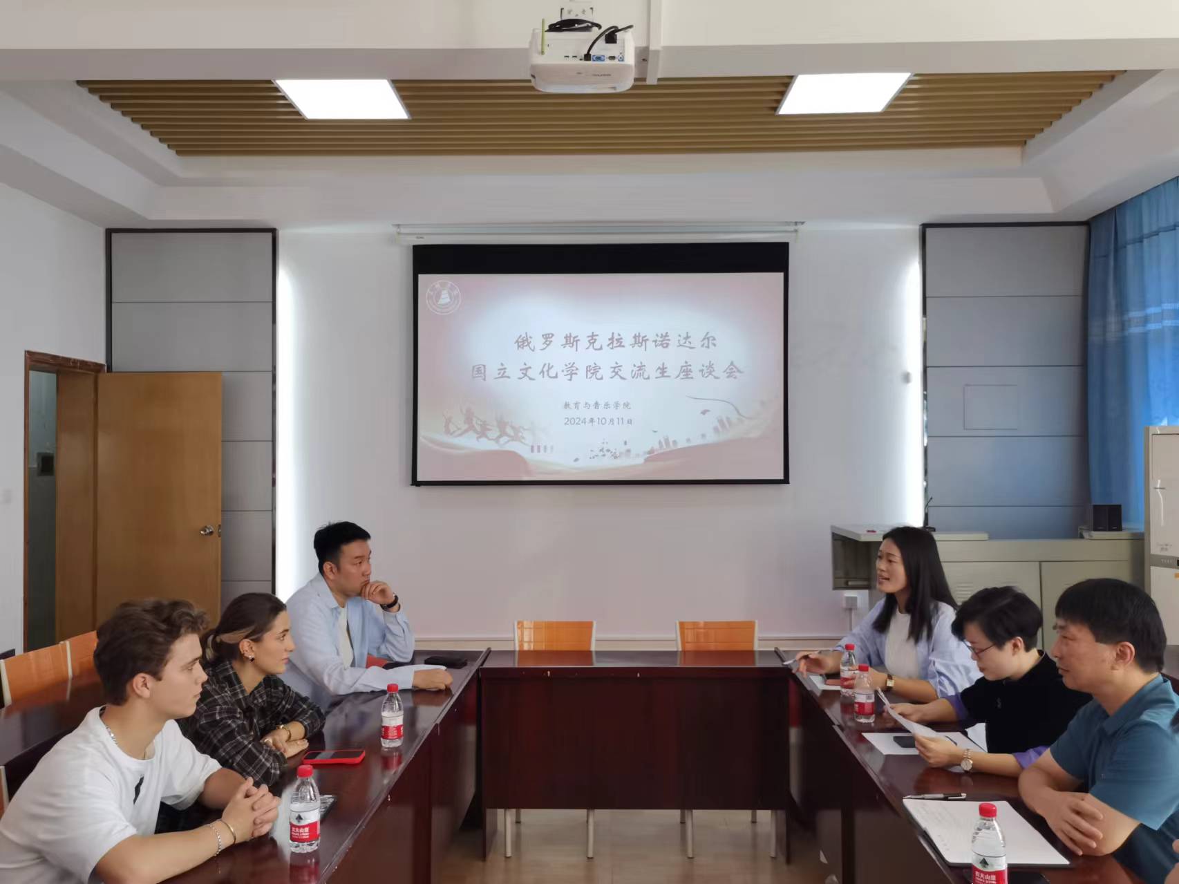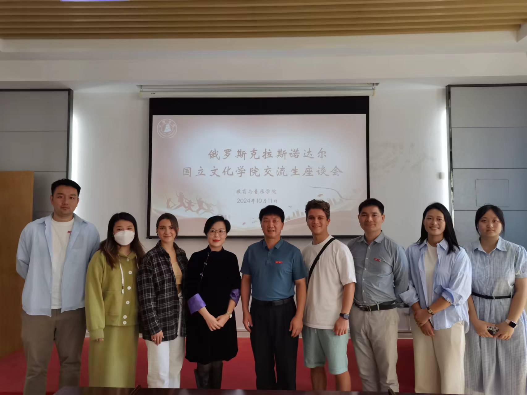 10月11日上午,教育与音乐学院举办俄罗斯克拉斯诺达尔国立文化学院交流生座谈会。院党委书记伍荣生、对外合作与交流处副处长朱悦、院党委副书记缪大旺等参加此次座谈会。