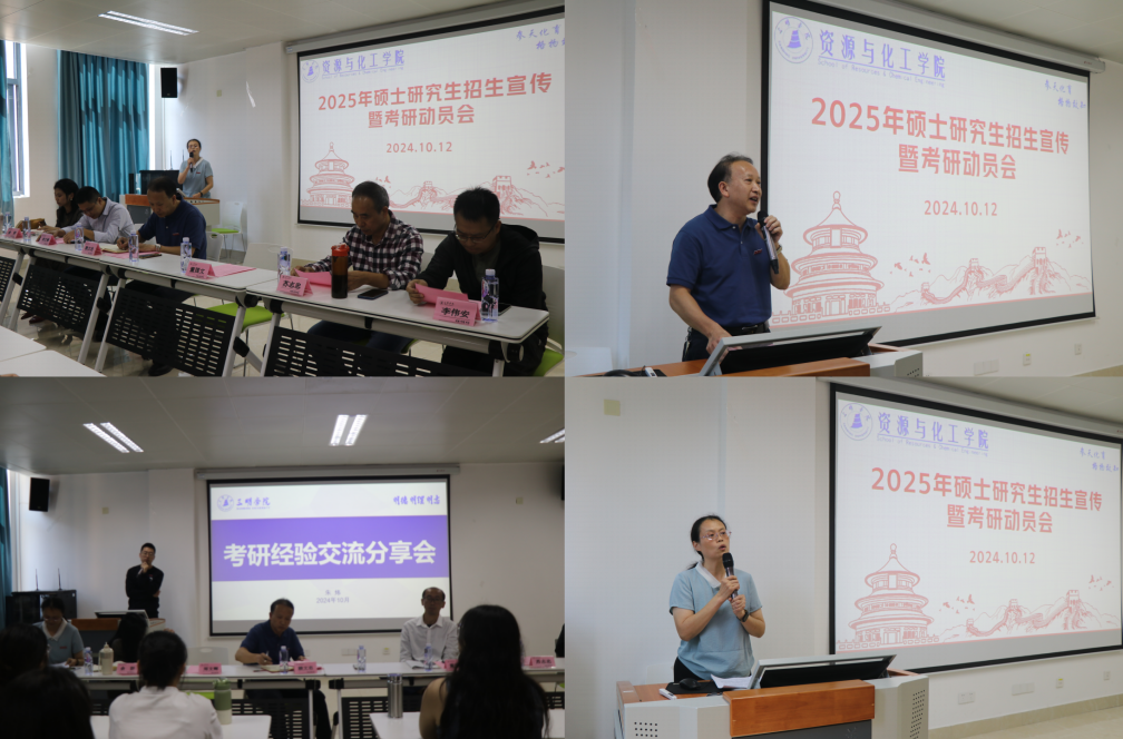 为进一步提升学院教育培养质量,激发学生报名研究生入学考试积极性,强化其考研信心,资源与化工学院于10月12日中午在工科楼A403会议室召开2025年硕士研究生招生宣传暨考研动员会,资源与化工学院党委书记赖文忠教授、各系领导老师及意向考研同学参会。