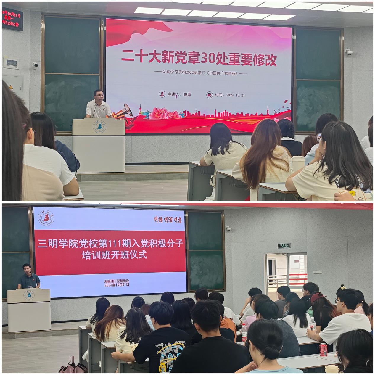 开班式上,海峡理工学院组织员对培训班的具体安排与纪律要求做了介绍与强调。海峡理工学院党委副书记陈勇作《二十大新党章30处重要修改》专题党课,从中国第一部党章的故事切入主题,围绕党章概述、党章发展历程、党章总纲部分、党章条文部分和党的二十大对党章的修改等五个部分做了详细解读,引导学员们深入学习了解党章,同时结合党的二十届三中全会精神,以党的最新理论引导学员们坚定理想信念,提升综合素质。