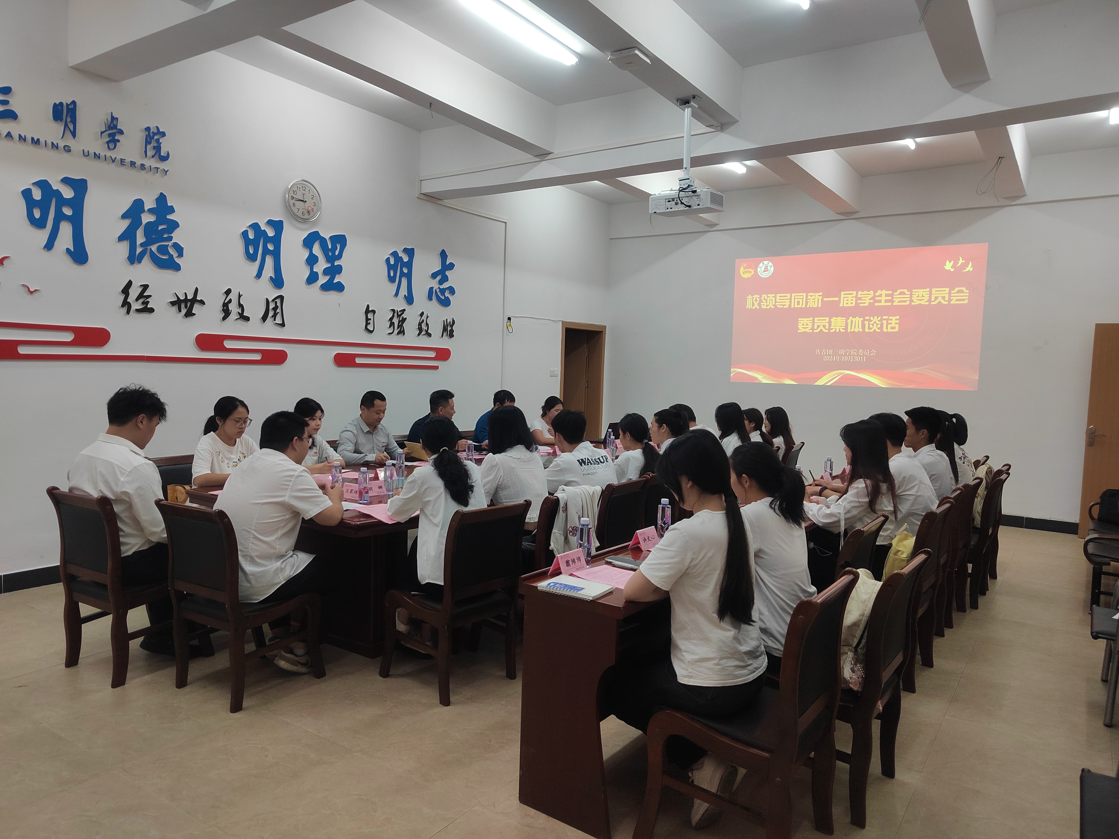 10月30日下午,校党委副书记李莉星同新一届校学生会委员会委员在南区学生活动中心二楼会议室开展集体谈话。学生处、团委负责人参加会议。