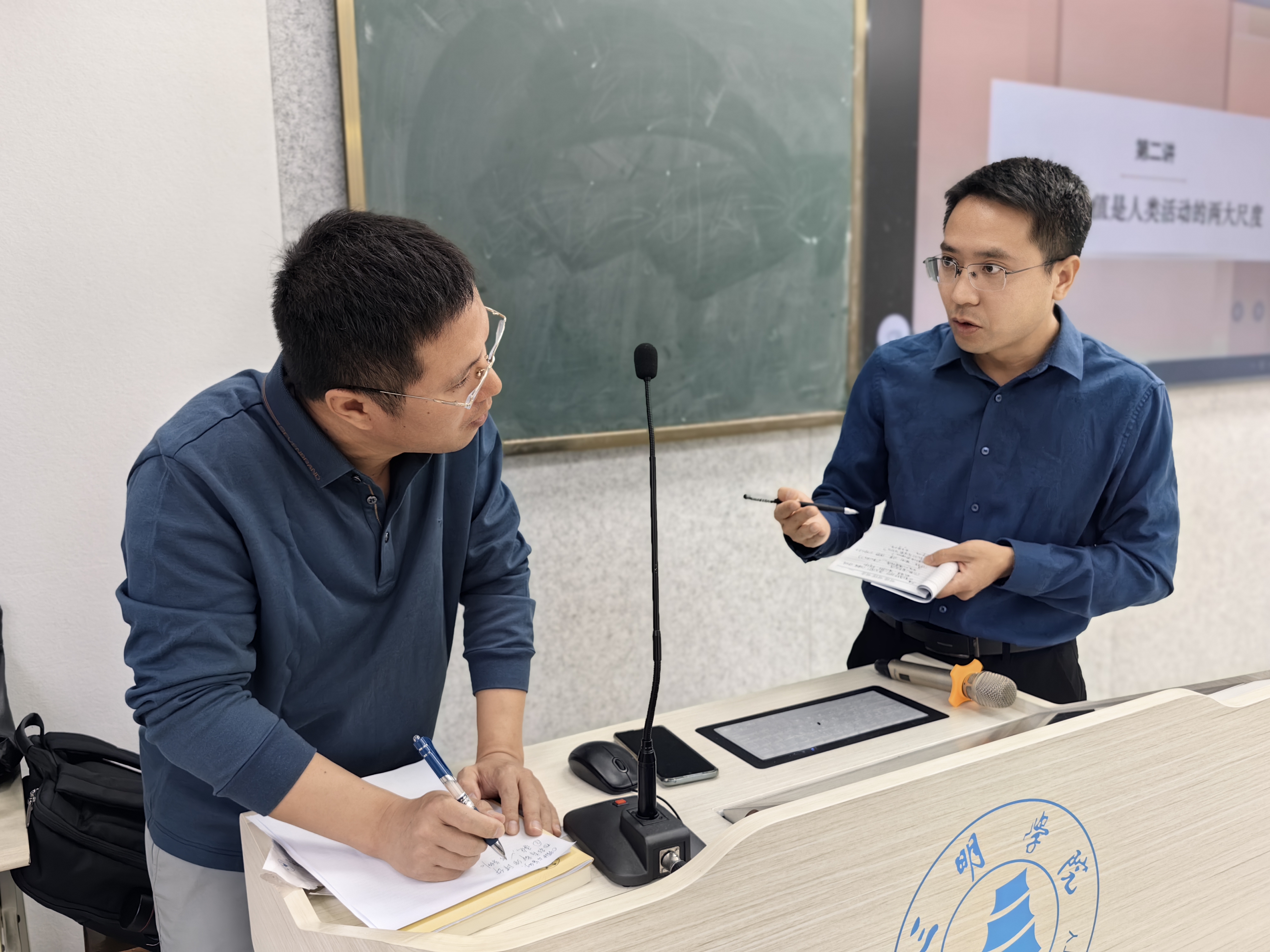 教学展示后,林密教授与我校思政课教师就教学过程中存在的难点痛点堵点问题进行了深入的交流和探讨。他强调,思政课教师要上好思政课,既要懂教材,也要有应变能力,使教材体系向教学体系转化;要抓理论,也要懂学生的兴趣点,坚持教师主导性和学生主体性相统一,要把道理讲深讲透讲活,并鼓励青年教师要积极参加各类教学竞赛,以赛促教,修炼内功。