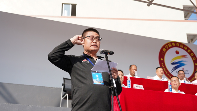 裁判员代表、体育与康养学院教师崔胜利和运动员代表、机电工程学院学生严筱祈庄严宣誓。