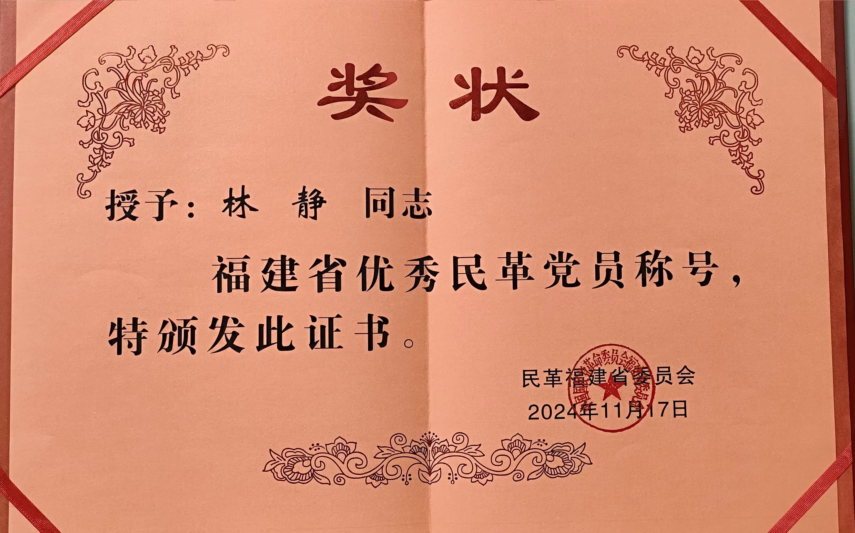 近日,纪念民革福建省委员会成立70周年活动在福州举办,民革福建省委员会对全省先进集体和先进个人进行表彰。民革yl6809永利官网支部主委、yl6809永利官网科技处(社科处)副处长林静获授予“福建省优秀民革党员”称号。