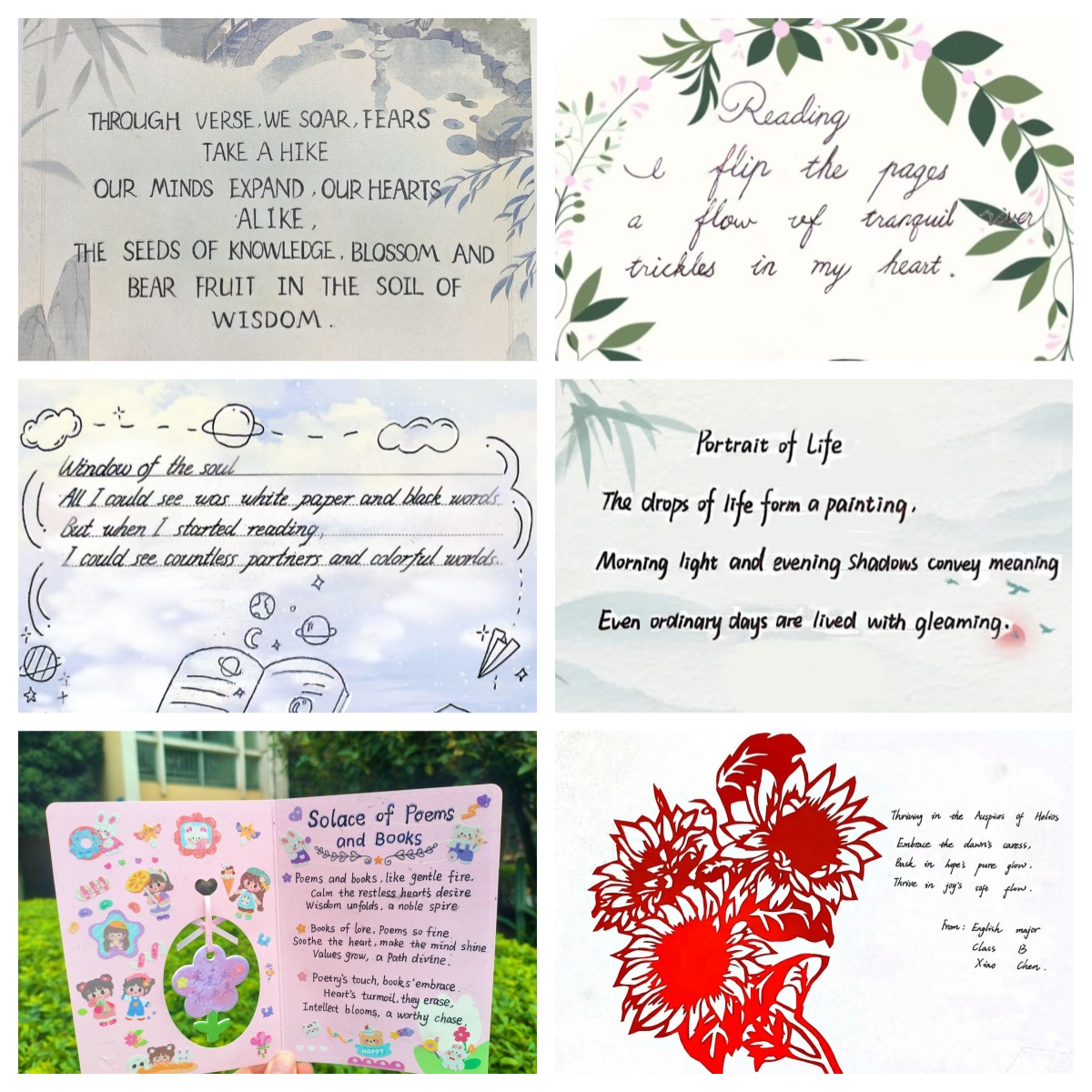 此次比赛以“诗书熨心浮,启智润心灵”为主题,参赛选手围绕符合社会主义核心价值观的理念进行手写原创。本次活动共收到62份作品,评委老师和专业学生评审团结合“主题围绕、视觉效果、英语语法、创新性”等方面进行线下评选。一首首三行英文诗作品主题鲜明,内容积极向上,不仅展现了同学们良好的英文写作能力,更体现了他们欣赏美、发现美、创作美的良好素养。其中,10份作品脱颖而出,23英语师范B班陈婉莹、23财务管理班车金宇获得此次比赛的一等奖。
