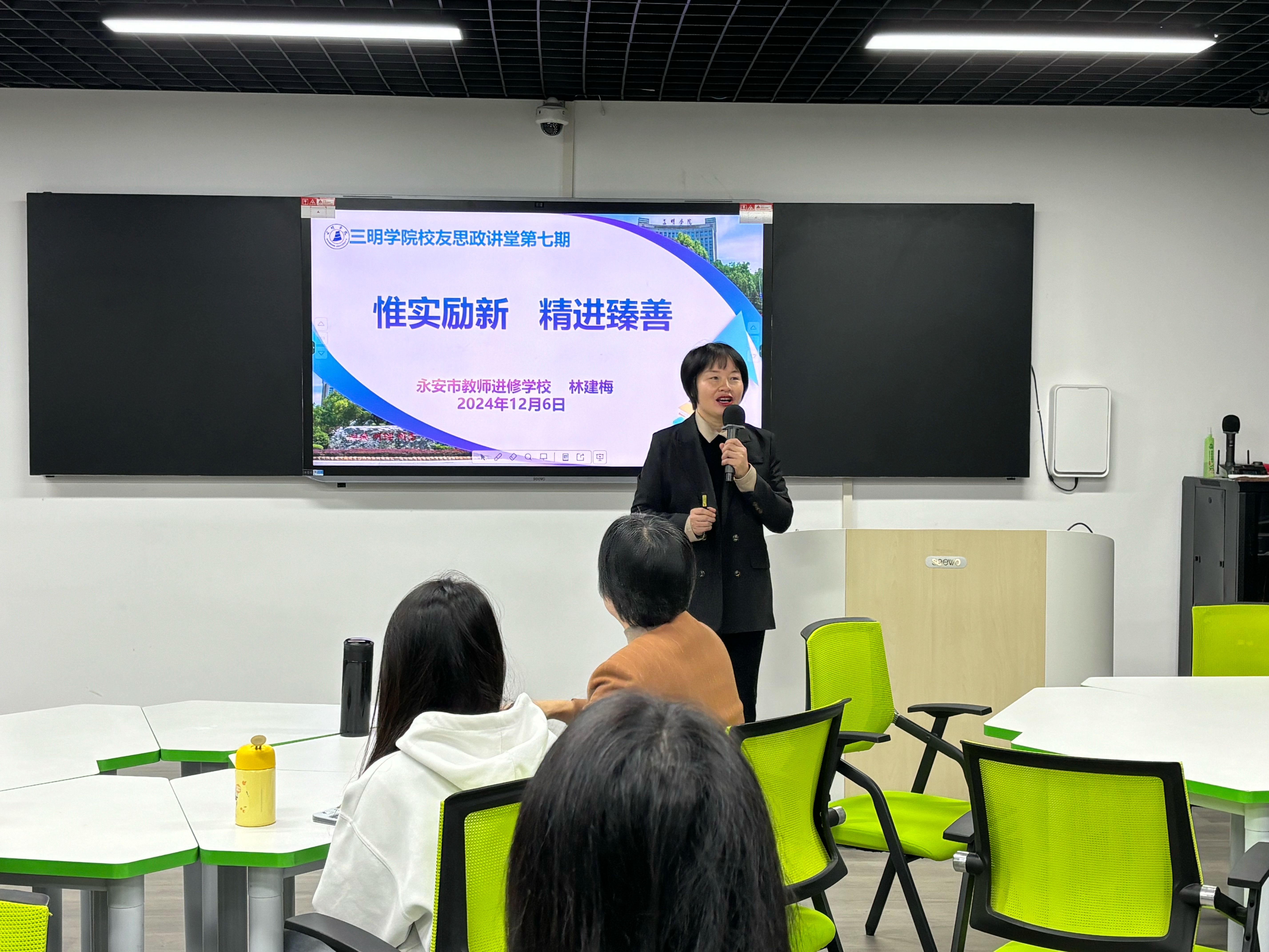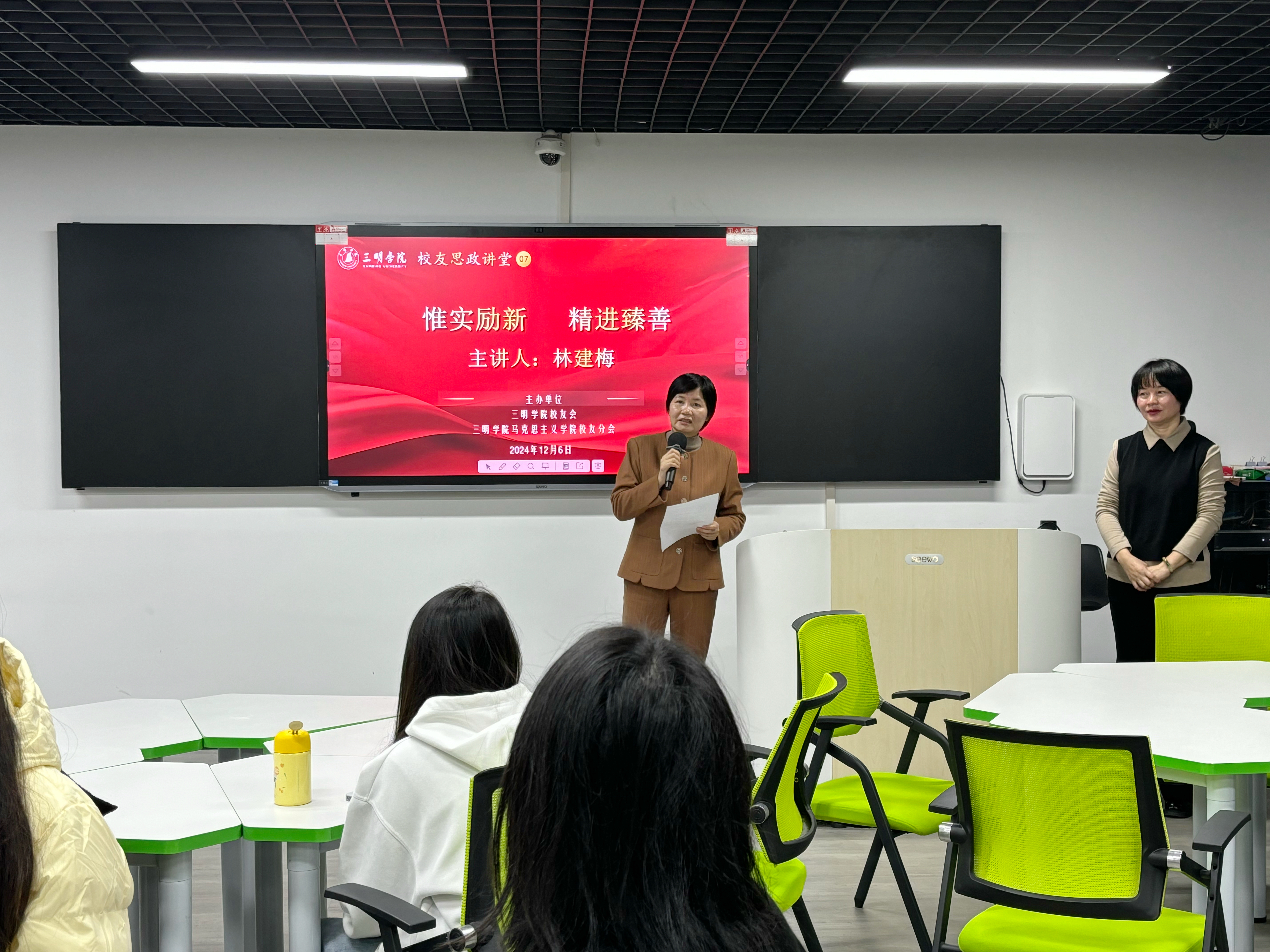 12月6日,yl6809永利官网校友会、马克思主义学院校友分会联合举办的“校友思政讲堂”第七期在明德楼(二)智慧教室开讲。本期讲座由我校1992级政教专业校友、永安市教师进修学校正高级教师、福建省五一劳动奖章获得者林建梅主讲。马克思主义学院党委书记主持。