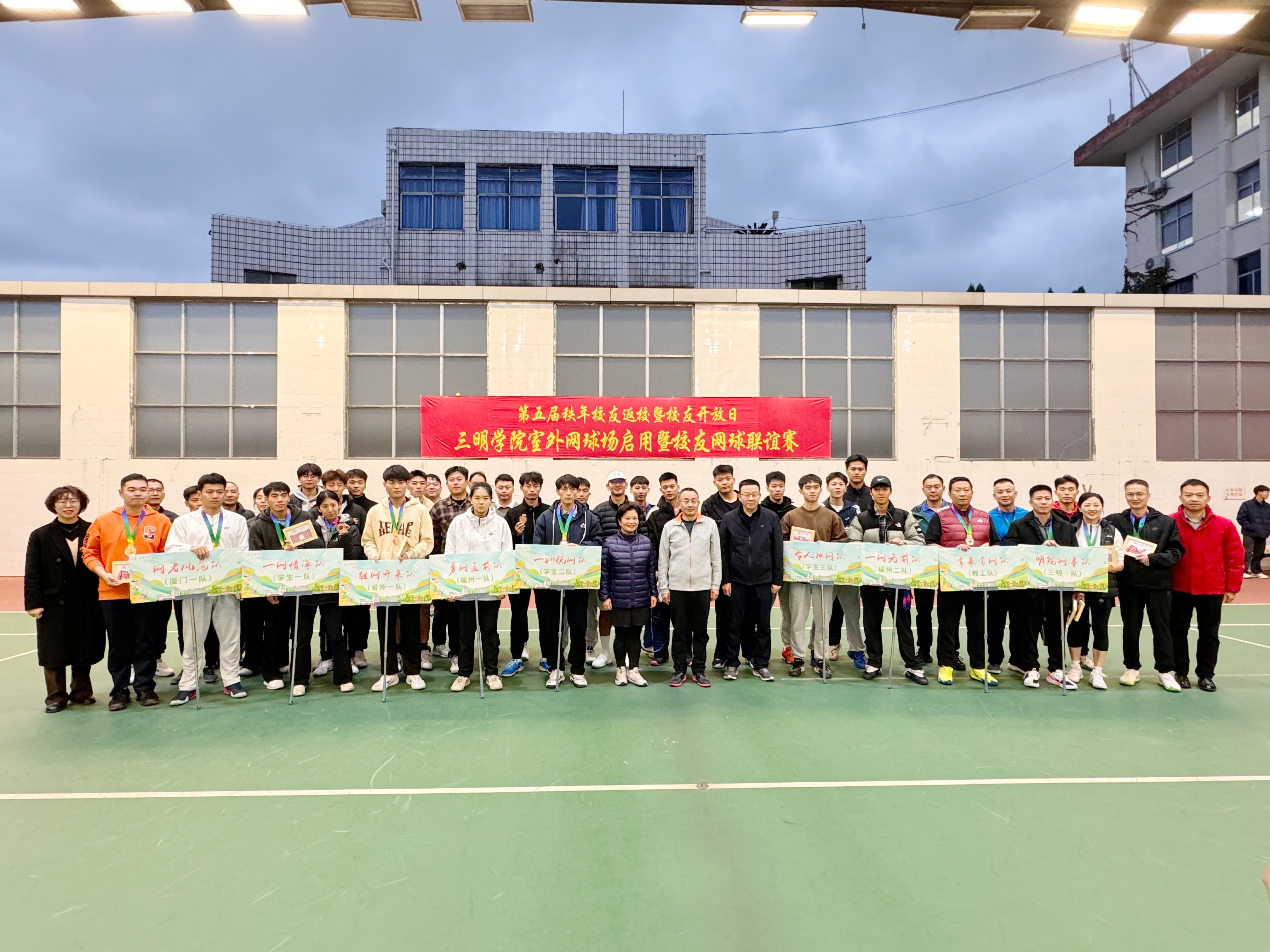 本次校友网球联谊赛以“网聚明院,再续球缘”为主题,由校友总会主办,网球校友会、体育与康养学院校友分会共同承办。福州、厦门、杭州、安徽等地校友以及校内师生共9支代表队参赛。赛场上,选手们的每一次挥拍、每一次击球都充满着激情与活力,观众席上的加油声此起彼伏,为参赛者们加油鼓劲。最终,经过激烈比拼,由厦门校友组建的“网者风范”队、市区校友组建的“明院网事”队获得一等奖,由教师代表组建的“常来常网”队、福州校友组建的“勇网直前”队(福州一队)获得二等奖,省外校友组建的“继网开来”队、福州校友组建的“一网无前”队(福州二队)及由学生代表组建的“一网情深”队、“一如既网”队、“令人神网”队获得三等奖。