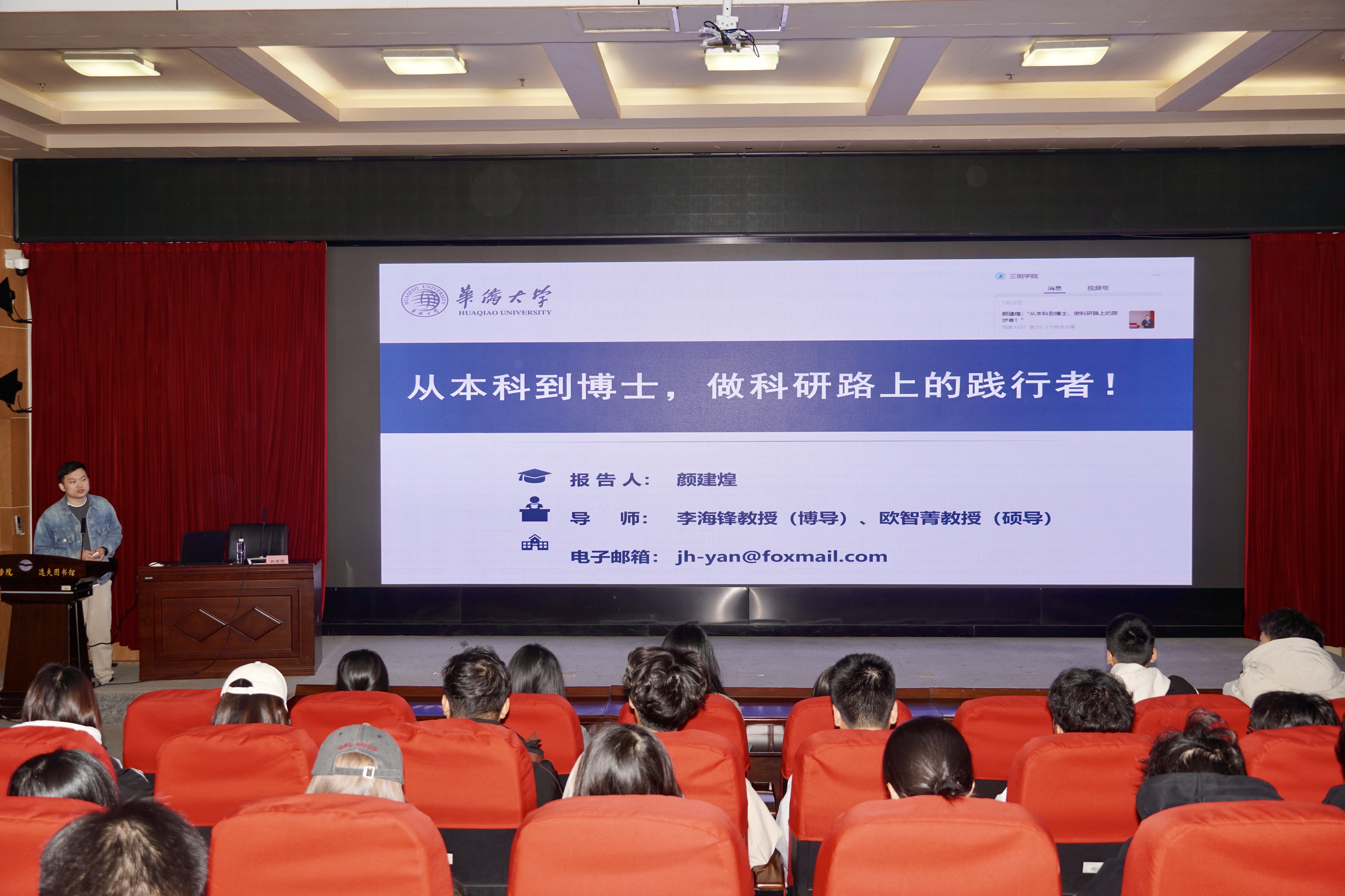 校友颜建煌首先分享他博士研究生期间的科研思路,从本科生如何入门科研,如何看文献,如何创新,如何获取学术资源等四个方面做了详细介绍;随后,就论文研究方向着重进行介绍,与部分在校生进行交流,他提出研究生开展学习和研究要循序渐进,要在不断锻炼自身的同时做好与自己现阶段能力相匹配的事。最后,他鼓励学子们在研究过程中勇于创新、注重细节,确保研究过程的严谨性和成果的有效性,并希望未来能有更多机会与学子们进行深入的学术交流和探讨。