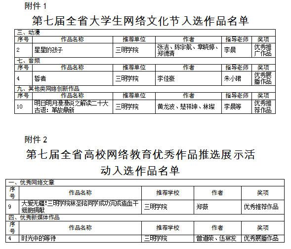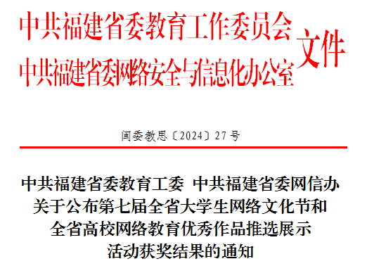 日前,中共福建省委教育工委 中共福建省委网信办公布第七届全省大学生网络文化节和全省高校网络教育优秀作品推选展示活动获奖结果,我校师生斩获优秀推广作品1项,优秀展播作品2项,优秀推荐作品2项。