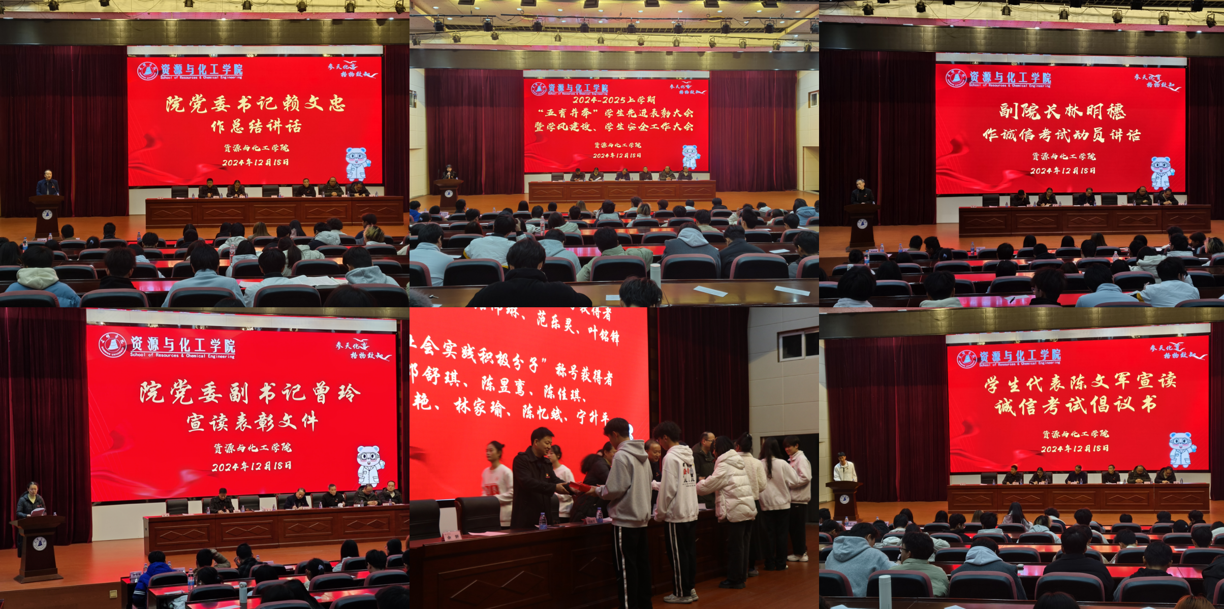 会上,院党委副书记曾玲宣读表彰文件,其中涵盖了国家奖学金、励志奖学金获得者,在学术、社会实践、创新竞赛、体育赛事等“五育”方面表现优异的个人和集体并为其颁奖。颁奖仪式后,2022级环境工程班陈嘉玫作为学生代表分享学习经验和成长感悟;副院长林明穗作诚信考试动员讲话,他强调了诚信考试的重要性,鼓励学生以“诚信”为本,展现学院学子的良好风貌;2024级学生代表宣读诚信考试倡议书并签订诚信考试承诺书,号召全体学生自觉遵守考试纪律,共同维护公平公正的考试环境。