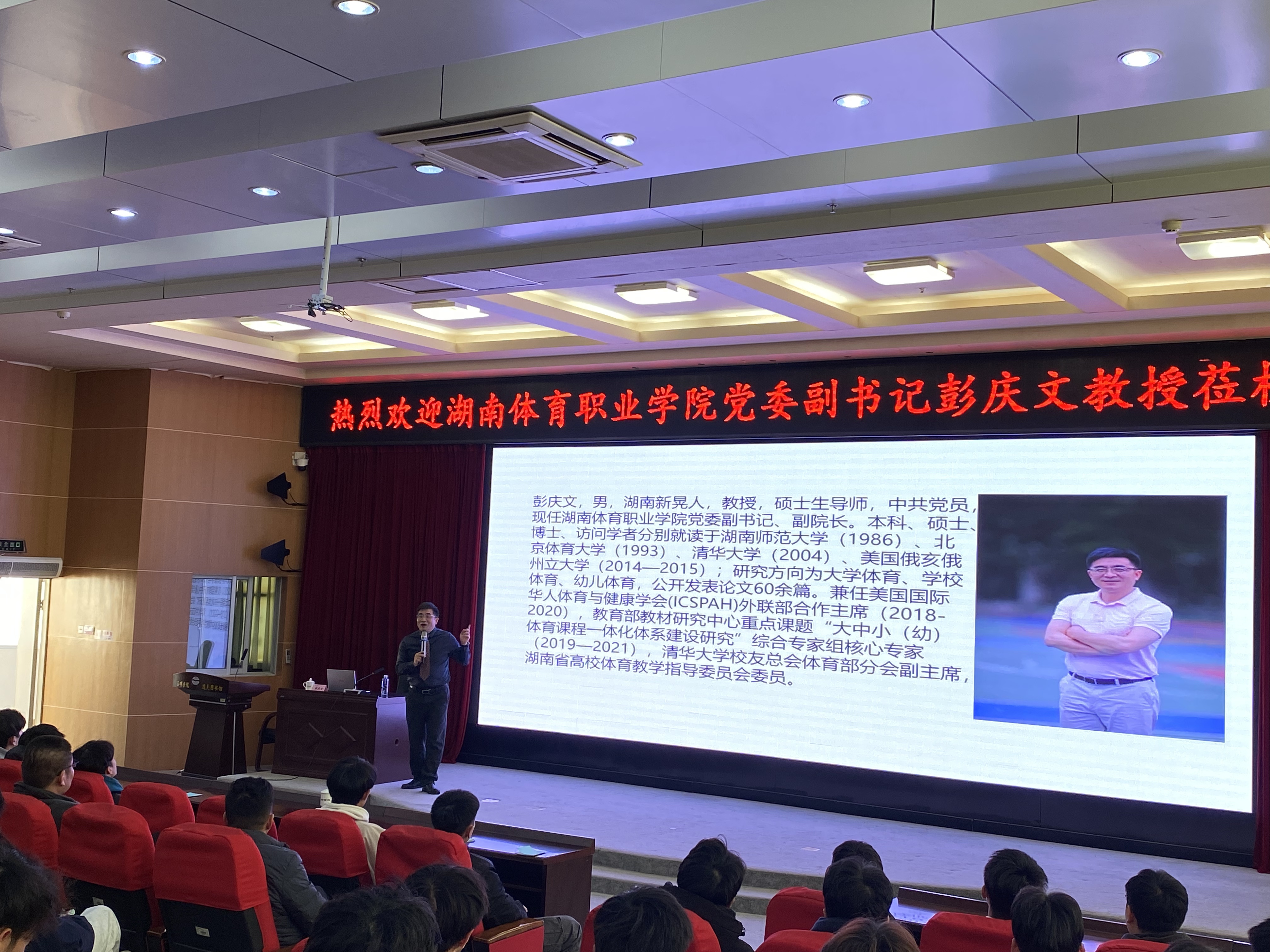 2024年12月16日,湖南体育职业学院党委副书记彭庆文教授受邀到体育与康养学院做《从健康到幸福:我国学校体育的发展走势—漫谈<新课标>》专题学术报告,教师代表及2022级全体学生聆听了此次讲座。