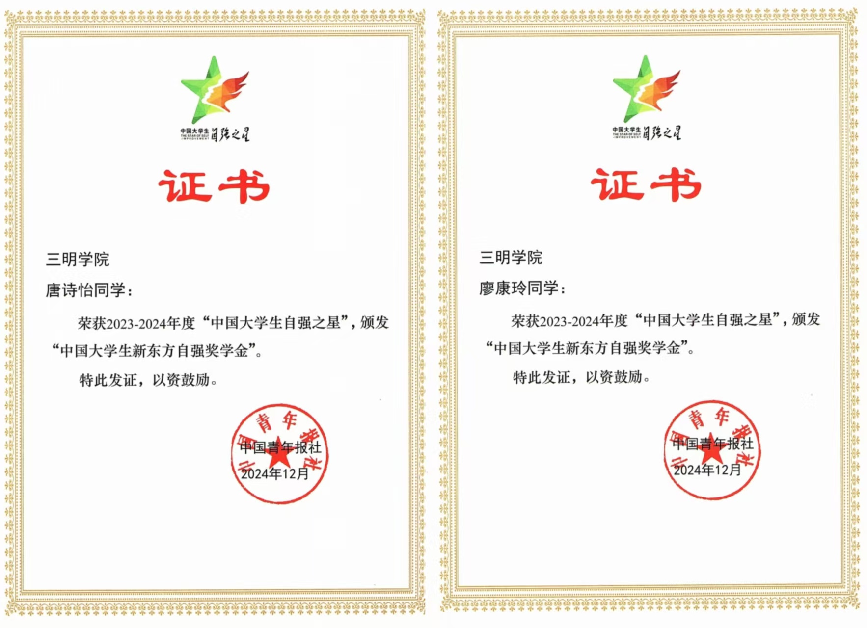 近日,由共青团中央、全国学联指导,团中央基层建设部、中国青年报社主办的2023-2024年度“中国大学生自强之星”奖学金推报活动结果揭晓。我校文化传播学院2020级汉语言文学(师范)专业唐诗怡同学、教育与音乐学院2021级小学教育1班廖康玲获评“中国大学生自强之星”荣誉称号,获颁“中国大学生新东方自强奖学金”。