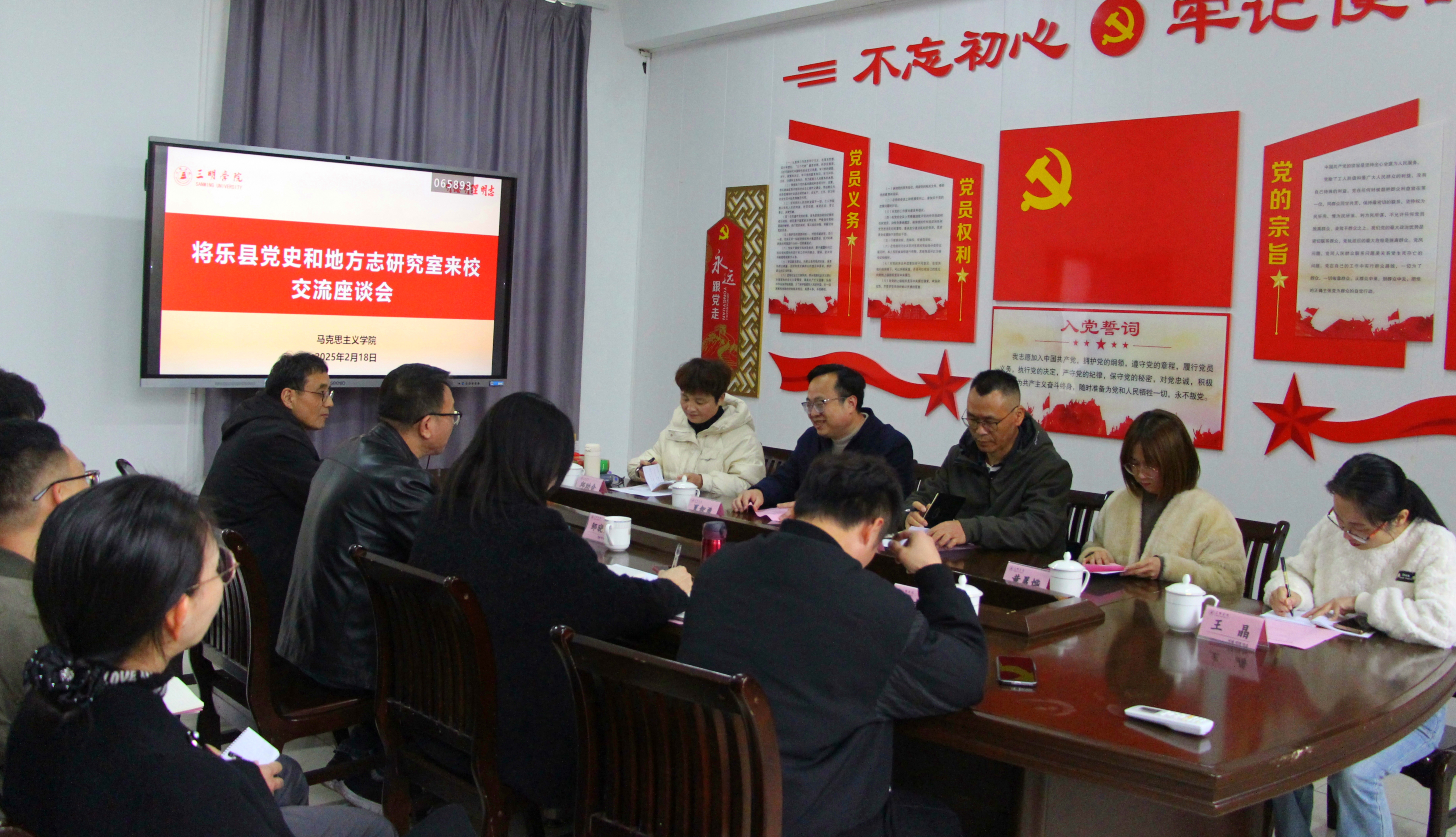 2月18日下午,将乐县党史和地方志研究室一行到马克思主义学院做深入交流,并参观了我校马克思主义理论学科实验中心。校社会合作处处长夏智勇、校社会合作处副处长王晶、马克思主义学院院长邹晓芟、副院长欧阳秀敏、学科带头人范连生、中国近代史纲要教研室全体教师参加。