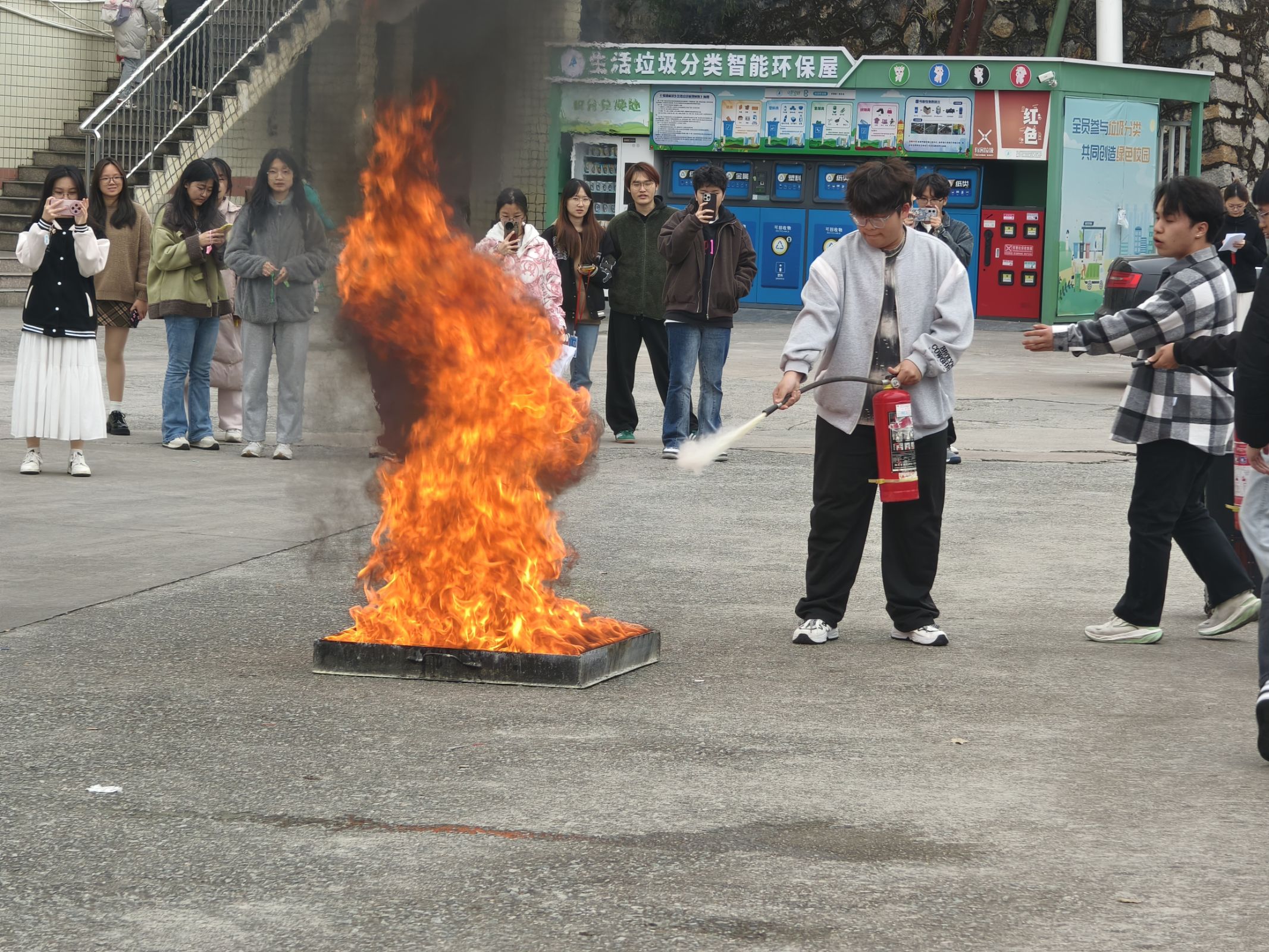 演练过程中,当“地震警报”声响起,同学们迅速反应,打湿手中的毛巾捂住口鼻,沿着预定的逃生路线有序撤离宿舍楼。撤离至指定的安全位置后,同学们在专业人士的耐心讲解下,学习了火灾逃生知识及不同类型灭火器的使用方法,并亲自上手实践。通过理论与实践结合的方式,同学们极大地增强了对于火场逃生方法的理解,有效增强了应对紧急情况的能力。