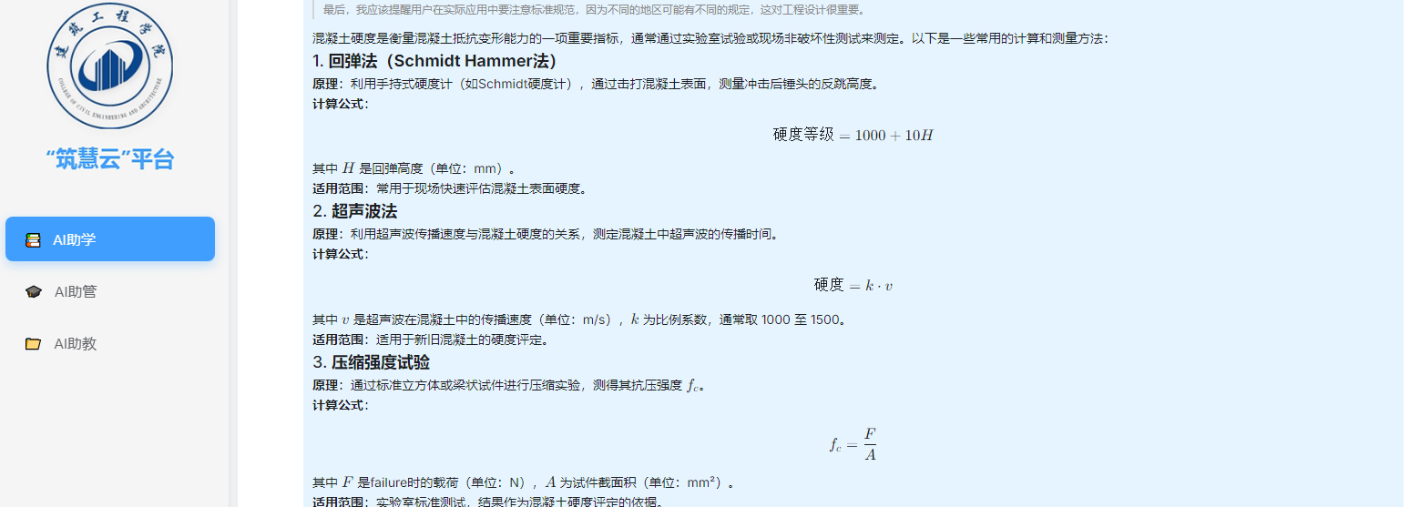 “筑慧云”平台由建筑工程学院智能建造与智慧交通专业和思政教育队伍共同研发,该平台基于深度学习技术构建,聚焦“助教、助学、助育、助评、助研、助管”六大核心领域,通过本地化部署deepseek模型,整合了课本知识、学生手册条款、评优评先标准等十余类结构化数据,构建起一个动态更新、全面覆盖的教育管理数据库。此外,系统结合学科知识图谱与教育管理逻辑框架,精准剖析学科难题,提供层次分明、循序渐进的解题路径,为学生提供个性化学习导航,有效提高自主学习效率。