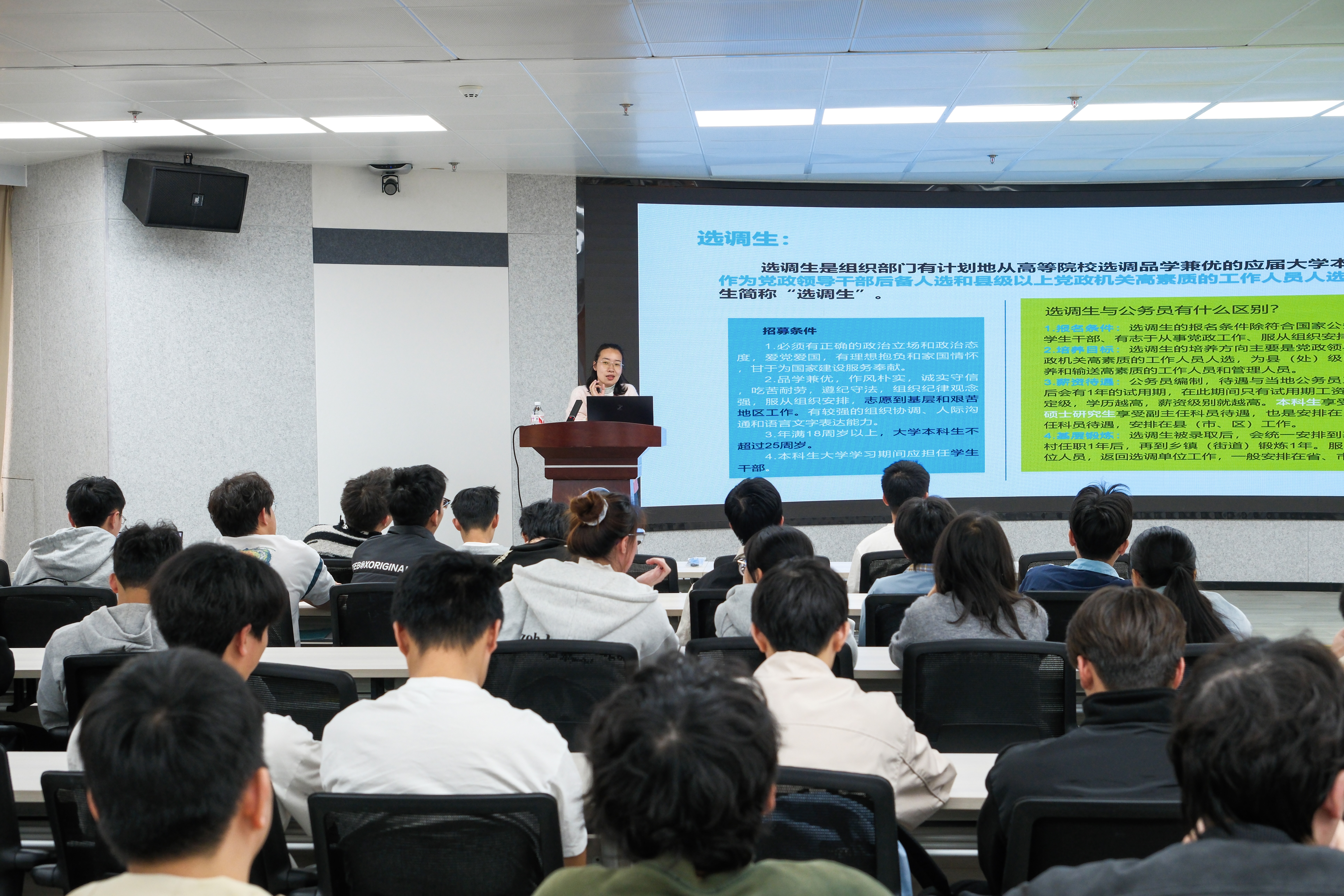 讲座聚焦当前就业形势分析与基层就业政策解读。就业指导中心负责人结合全国数据和学院往届毕业生去向情况,深入剖析信息工程领域就业趋势和当前毕业生就业机会,指出“新兴产业需求旺盛,但结构性矛盾依然存在”,鼓励学生夯实专业基础,主动拓宽职业视野。针对少数民族学生就业特点,廖老师重点解读“西部计划”“特岗教师”等基层专项政策,详细说明报名条件、服务内容及期满后考研加分、定向招录等优惠政策。“政策宣讲让我看到更多可能性,特别是家乡的基层岗位既能实现价值,又能助力乡村振兴。”来自藏族的学生伦珠表示。