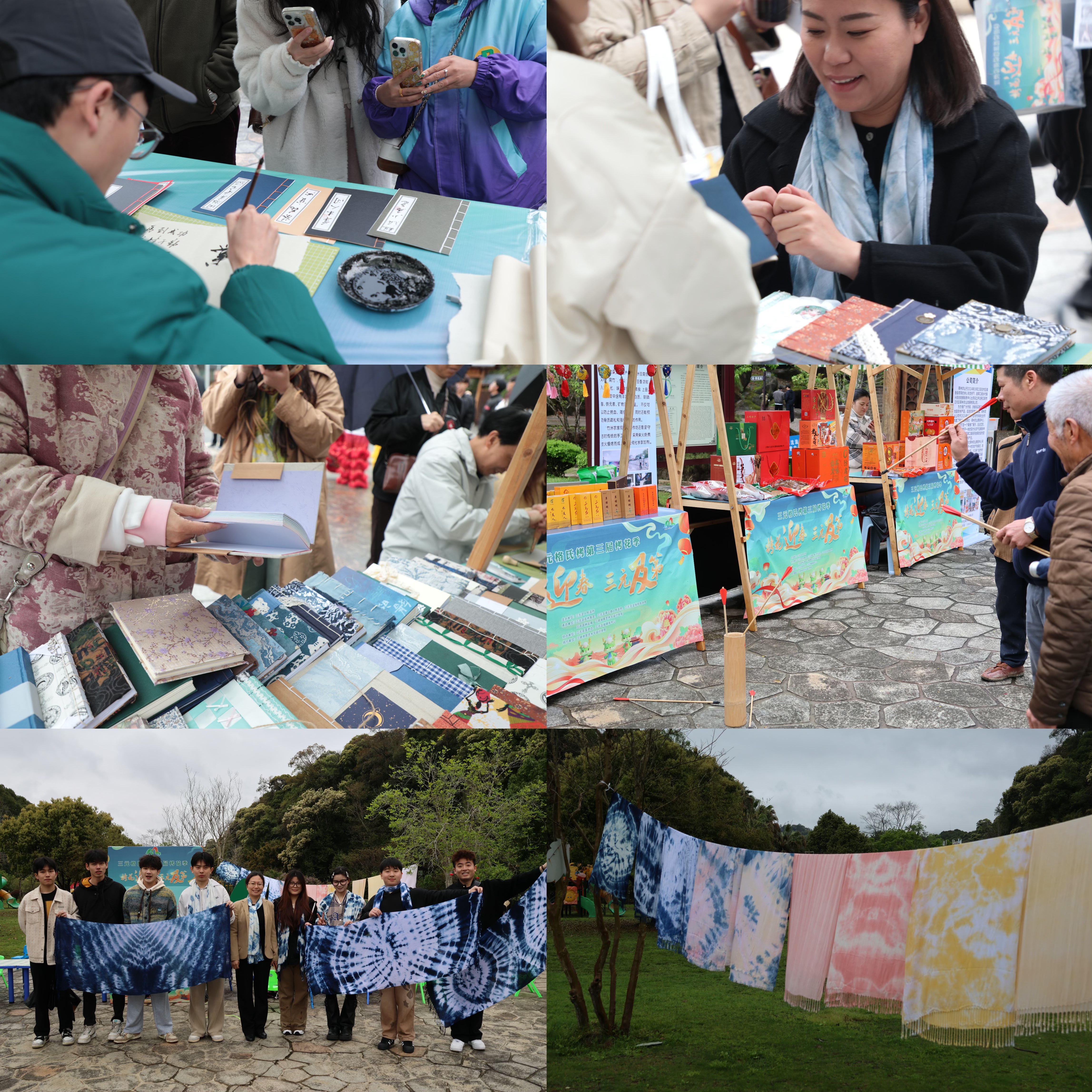 活动现场,美术学、服装与服饰设计、环境设计等专业师生借助专业所长,为游客提供扎染、环线书创作等非遗互动体验。齐栏、裁剪、打眼、穿纸钉、上皮、订线……在古籍制作与环线书创作区,师生们现场展示并指导游客体验传统古籍装帧技艺。从纸张的裁剪、纸捻钉的制作到如何用线装订,游客们在十余道传统工序中感受纸张与文字的传统韵味。扎染体验区,师生们向游客介绍扎染的历史渊源、文化内涵、工艺流程等内容,一步步指导游客们折叠、捆扎、浸染……创作出一件件色彩斑斓、图案各异的扎染作品,为栲花节增添了浓郁的艺术氛围。康养健康体验区,体育与康养学院的师生们为游客带来特色按摩,舒缓筋骨。