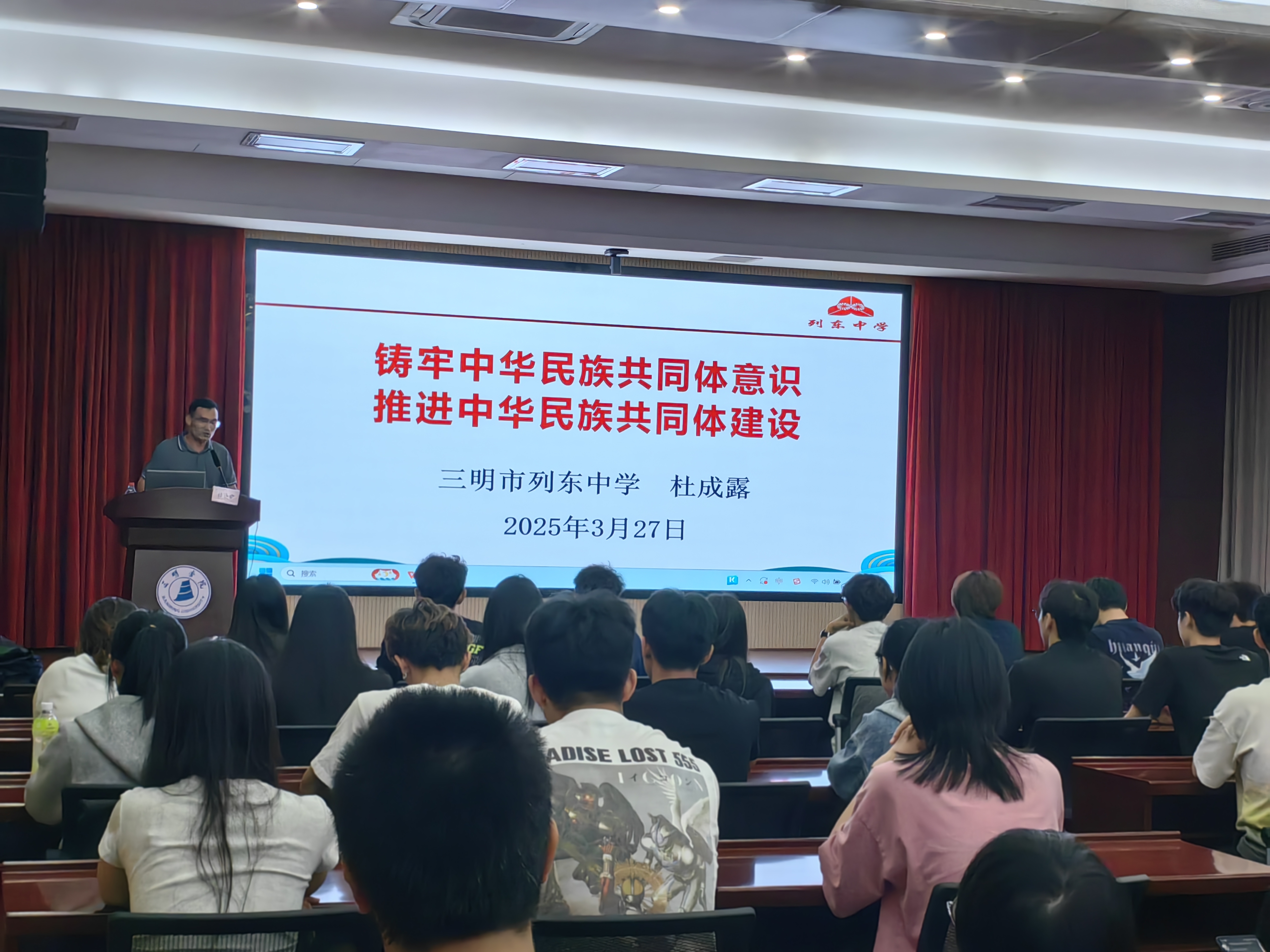 杜成露老师以《铸牢中华民族共同体意识,推进中华民族共同体建设》为题,以亲切语言、亲身经历开篇,讲述了他和三明市列东中学西藏班20余年共同成长的精彩人生;从理论高度、实践深度、思维广度深刻阐述了铸牢中华民族共同体意识的形成过程、丰富内涵、重大意义;从宏观层面、中观层面、微观层面深刻阐述了推进中华民族共同体建设形成发展的基本规律、重点任务、实施路径,让同学们更加理解了中华民族共同体建设的内涵和意义。