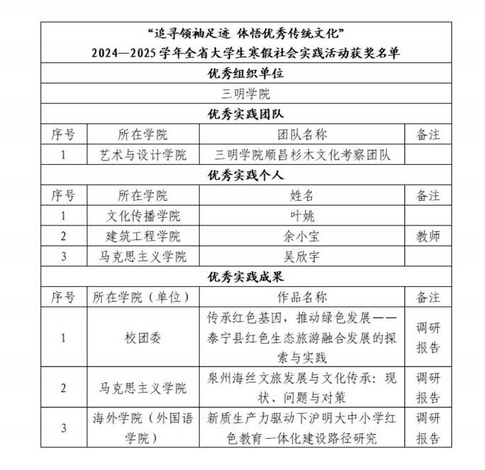日前,“追寻领袖足迹 体悟优秀传统文化”2024—2025学年全省大学生寒假社会实践活动评选正式揭晓,我校喜获8项表彰。其中,1支团队获评优秀实践团队,3名师生获评“优秀实践个人”, 3项成果获评“优秀实践成果”,学校获评“优秀组织单位”。