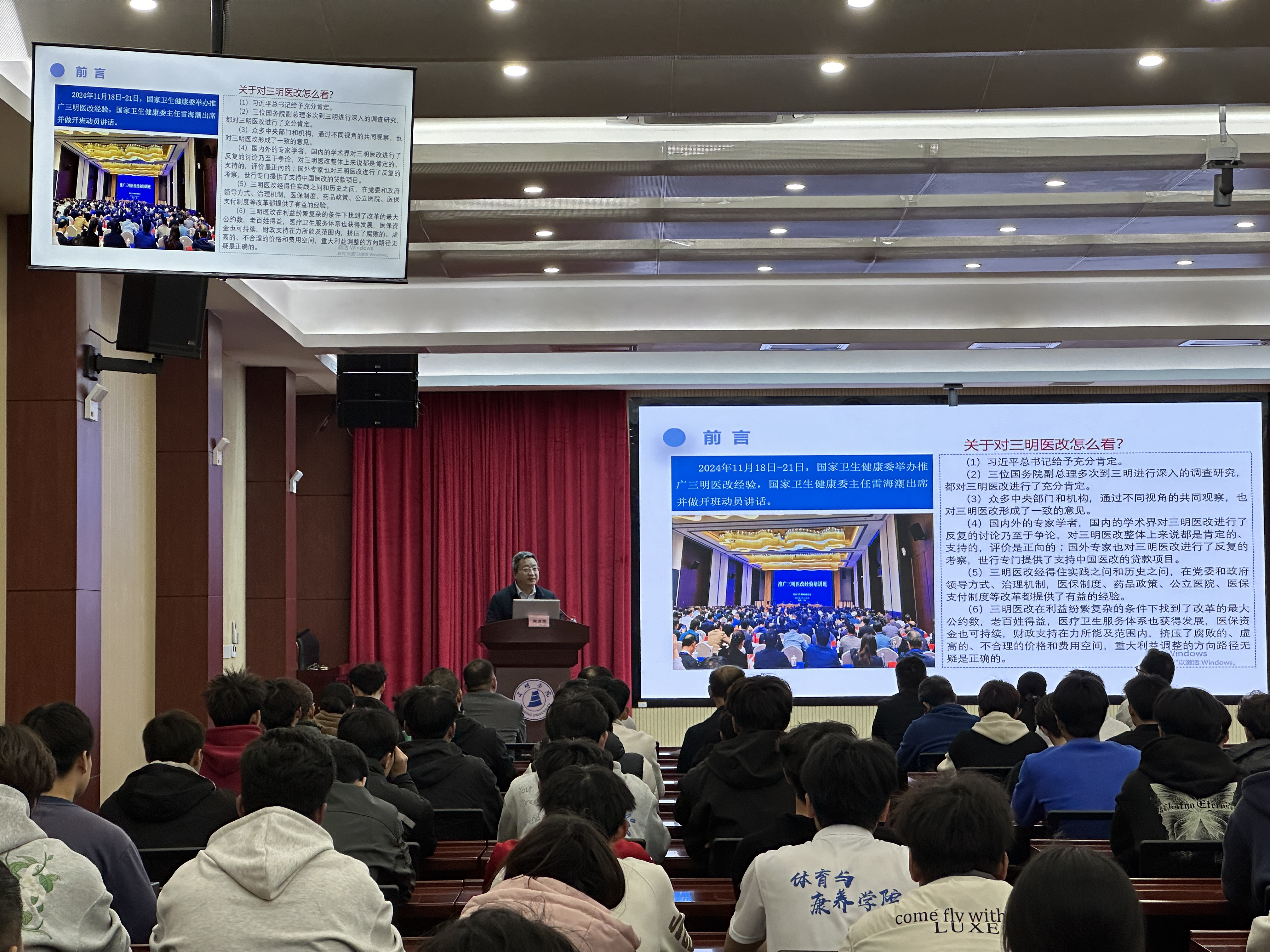 为深化对新医改政策与实践的认知,推动医疗卫生领域理论指导与体卫融合创新,4月2日,体育与康养学院特邀三明医改核心专家——三明市卫健委党组成员、副主任、市医改领导小组秘书处副主任周显葆莅临我院,作题为“新医改背景下三明模式的探索与实践”的专题讲座,学院师生代表150人现场聆听讲座。
