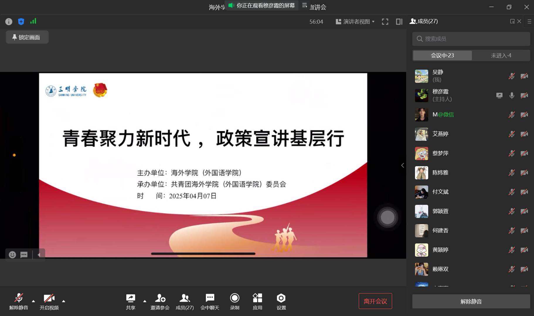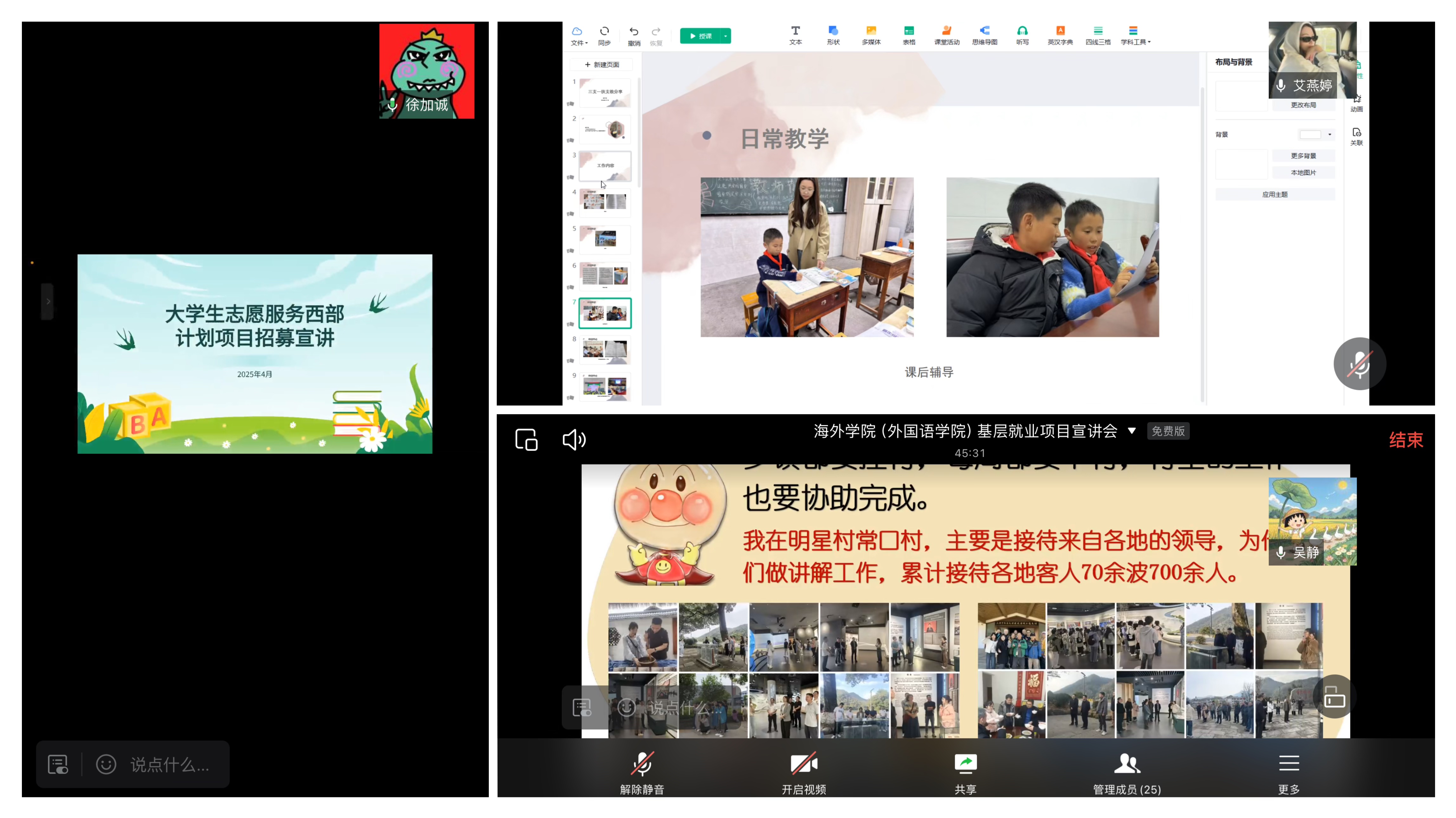 为充分发挥共青团助力大学生就业的积极作用,引领服务地方的青年担当。4月7日晚上,海外学院(外国语学院)举办“青春聚力新时代,政策宣讲基层行”为主题的基层项目就业线上宣讲会,2025届毕业生共计30余人参加。