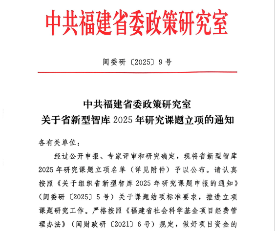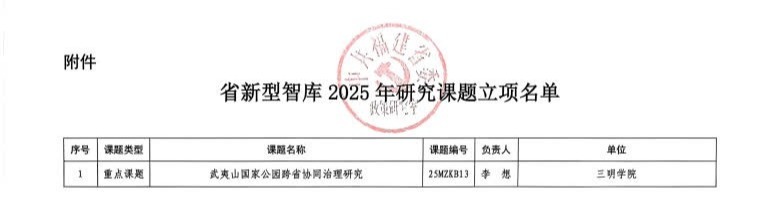 近日,中共福建省委政策研究室公布2025年省新型智库研究课题立项名单,yl6809永利官网经济与管理学院李想副院长主持的“武夷山国家公园跨省协同治理研究”获批重点课题。该课题聚焦跨省生态协同机制,旨在为国家公园跨界治理创新提供理论支撑与实践方案。