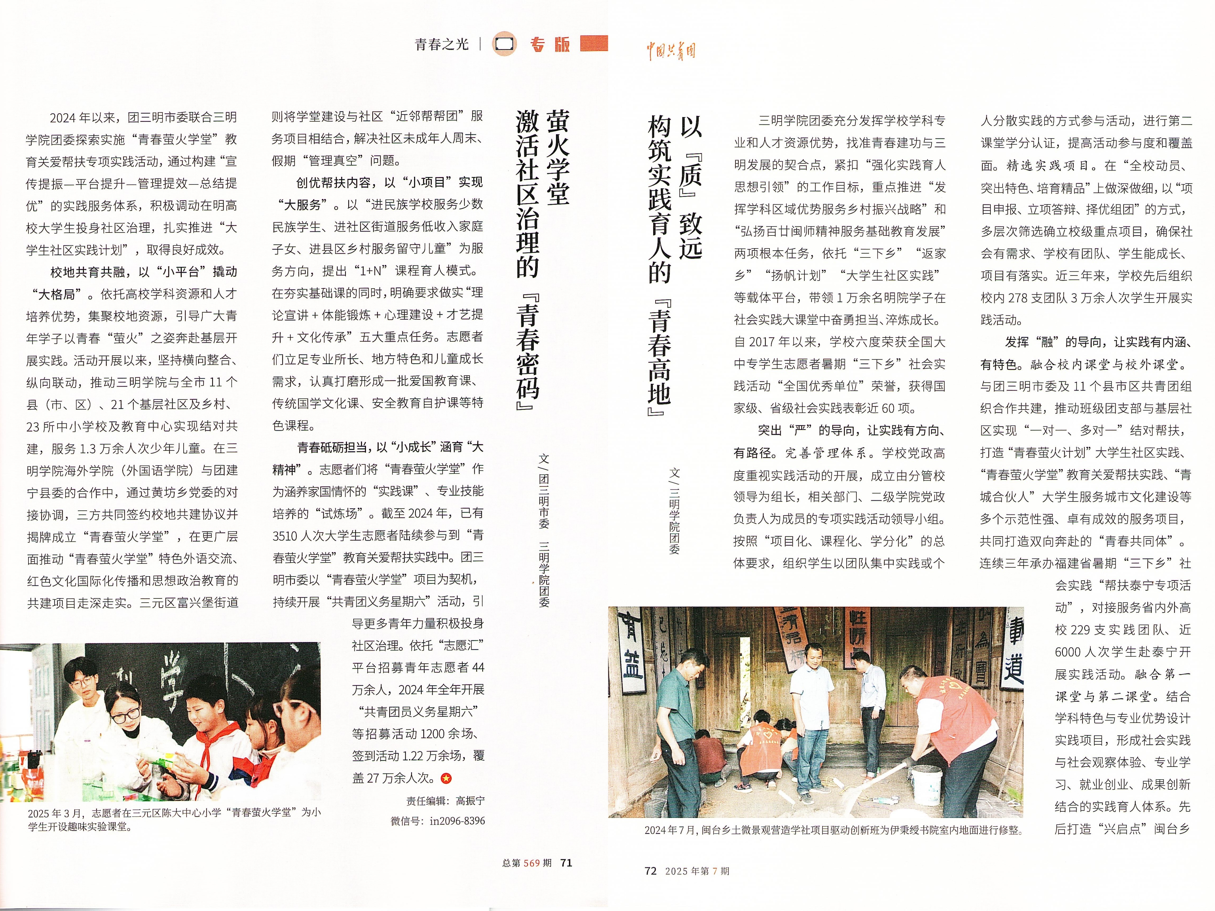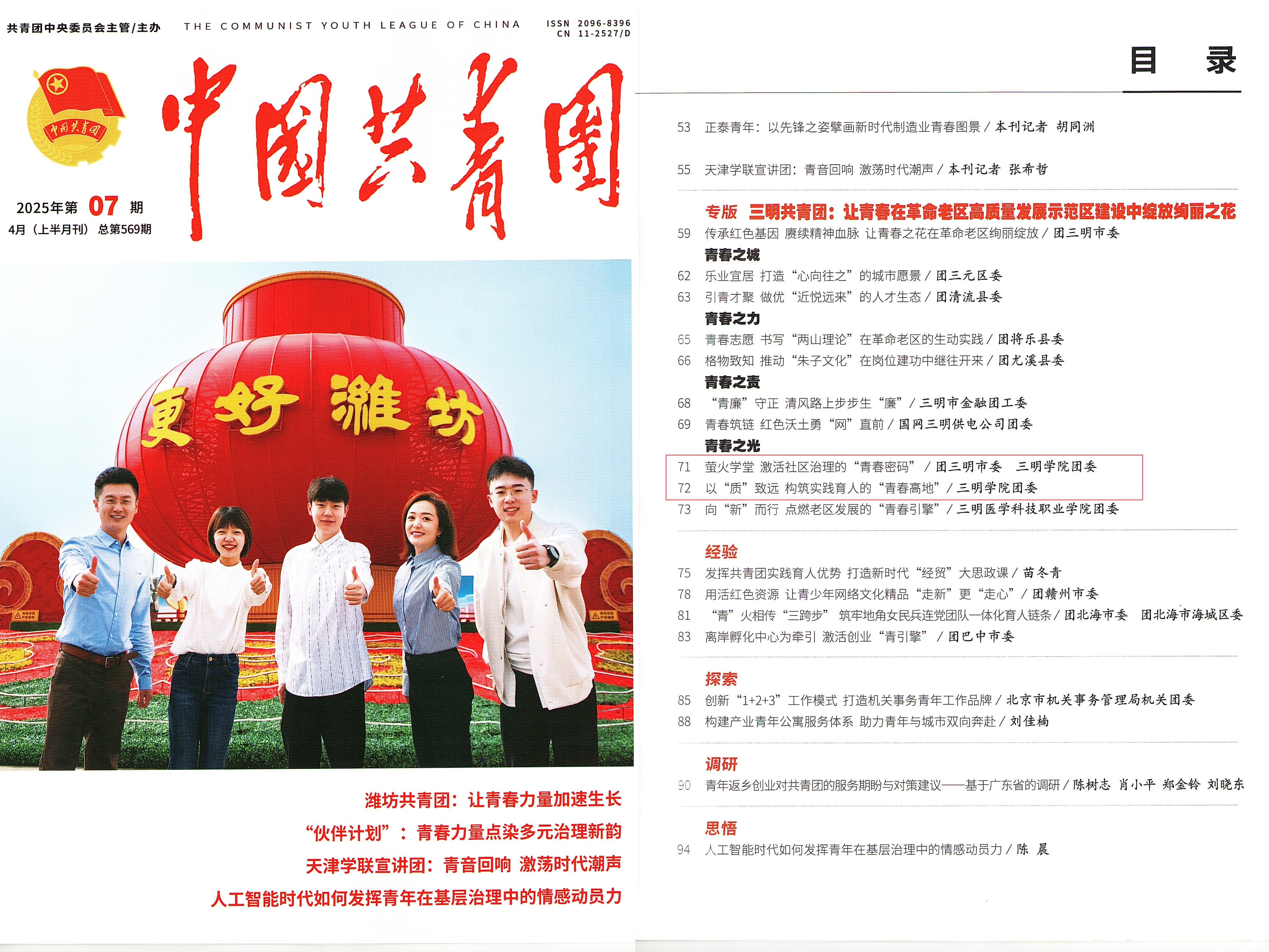 近日,由共青团中央主办的《中国共青团》杂志在2025年第7期刊出了我校共青团开展实践育人工作的两个创新案例,案例分别以《萤火学堂 激活社区治理的“青春密码”》《以“质”致远 构筑实践育人的“青春高地”》为题,这是我校共青团工作案例首次被该杂志刊发。