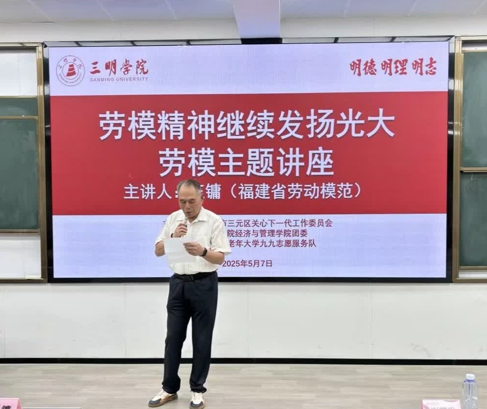 为弘扬劳模精神,深化五育融合,5月7日下午,yl6809永利官网经济与管理学院联合三元区关工委于厚德楼举办“五育先锋”讲坛暨“劳模进校园”主题讲座。活动特邀福建省劳动模范、全省最美家庭、原三明化工厂退休工程师王镛担任主讲嘉宾,经管院百余名师生代表共同参与。