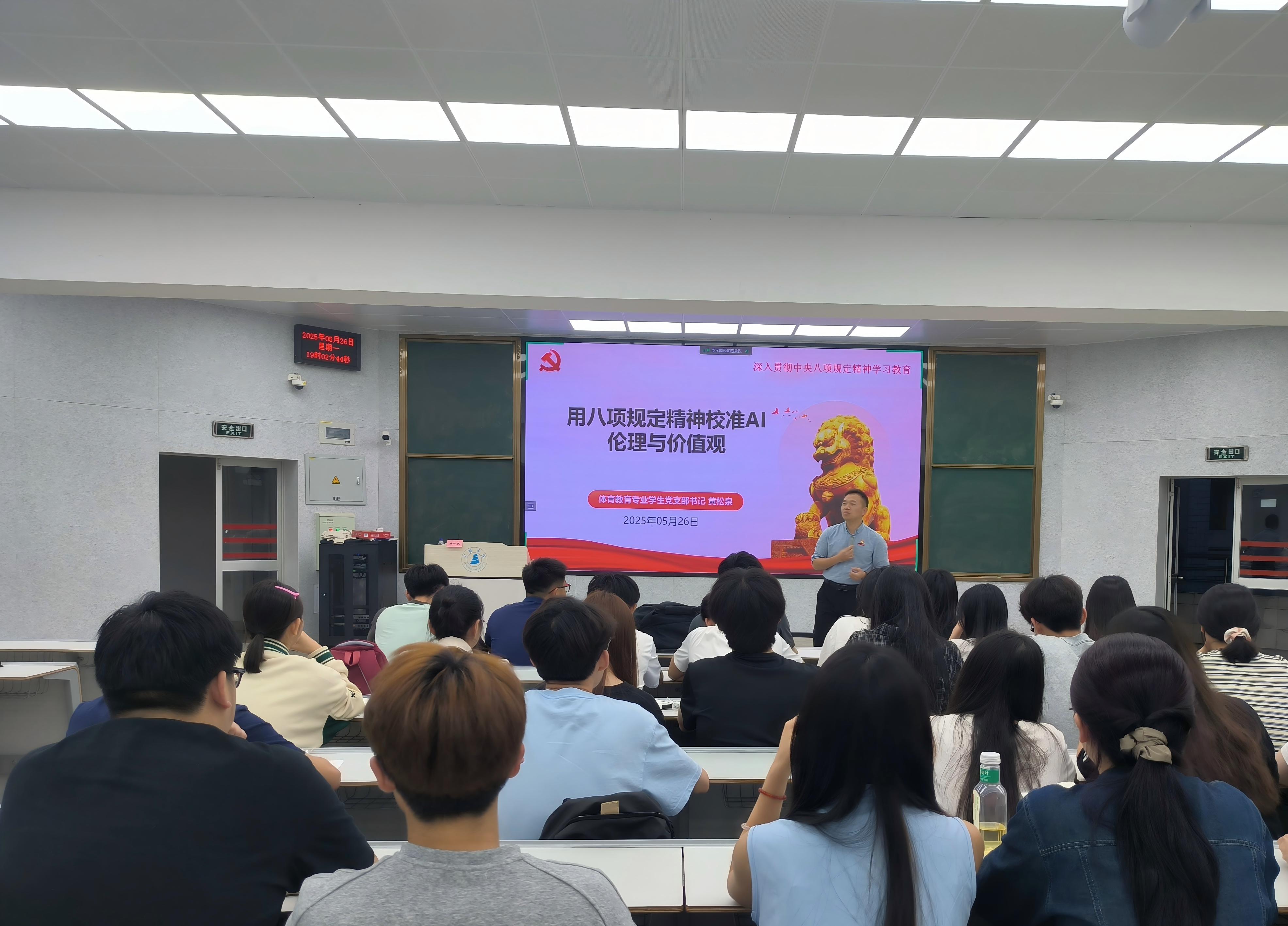 5月26日,体育与康养学院体育教育专业学生党支部副书记在博学楼223教室为学院全体学生党员带来了一场主题为《用八项规定精神校准AI伦理与价值观》的专题党课。