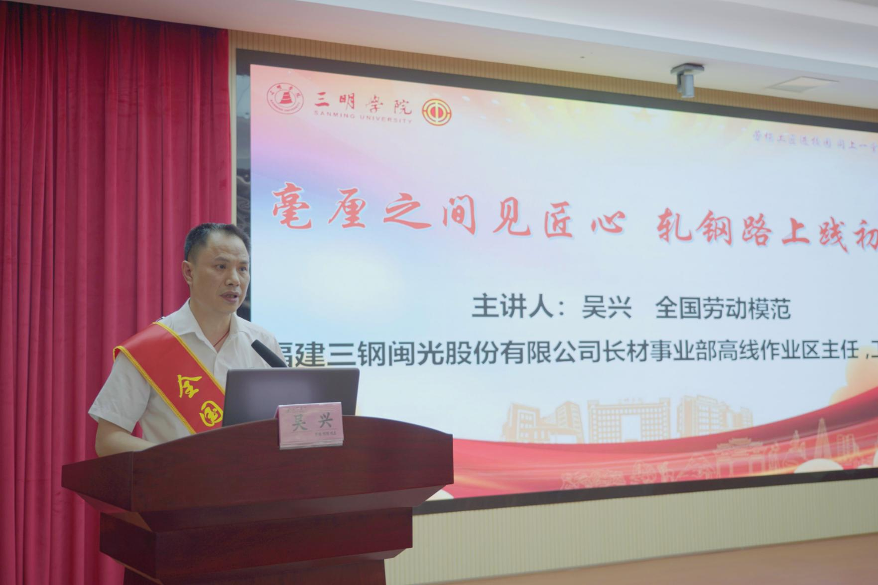 2025年5月26日,三明市总工会与yl6809永利官网马克思主义学院联合举办“‘凝心铸魂 齐心筑梦’劳模工匠进校园 同上一堂思政课”活动,邀请了钢铁、税务、林业领域的三位全国劳动模范和全国先进工作者——吴兴、胡安煦、谢汝根走进《思想道德与法治》的课堂,以“恪守职业道德”为主题为百余名同学上了一堂别开生面的“大思政课”。