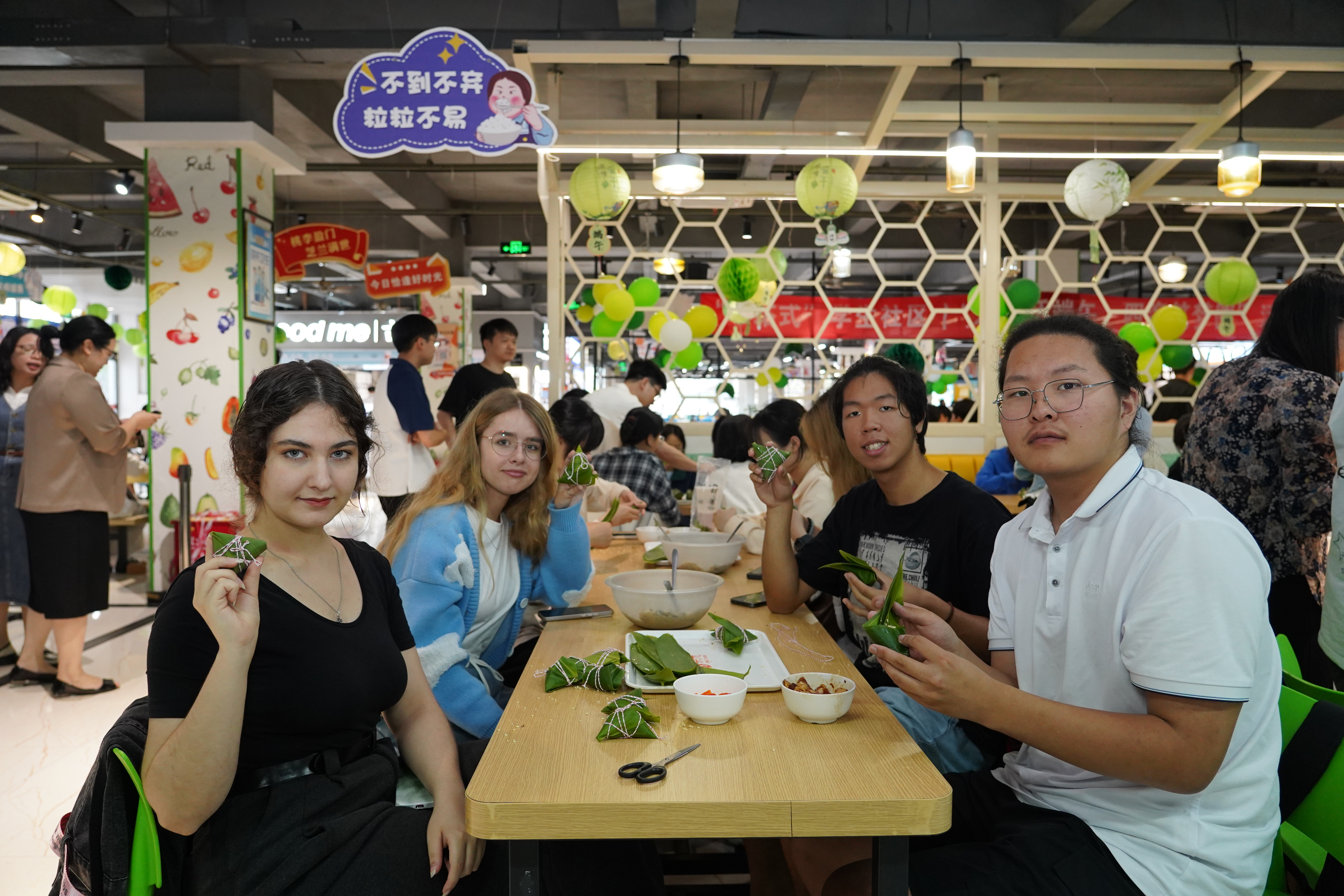 活动现场精心设置了五大主题体验区。雅乐品茗区以古琴雅乐、茶艺展示营造诗意氛围;艾墨传福区以粽叶为纸书写端午祝福;囊纳五瑞区、蒲艾盈馨区将民俗与创意结合,供师生制作香囊、艾草花束。最热闹的粽意工坊区里,师生在食堂师傅指导下,热情体验包粽子乐趣,在动手实践中感受节日温情与文化传承。