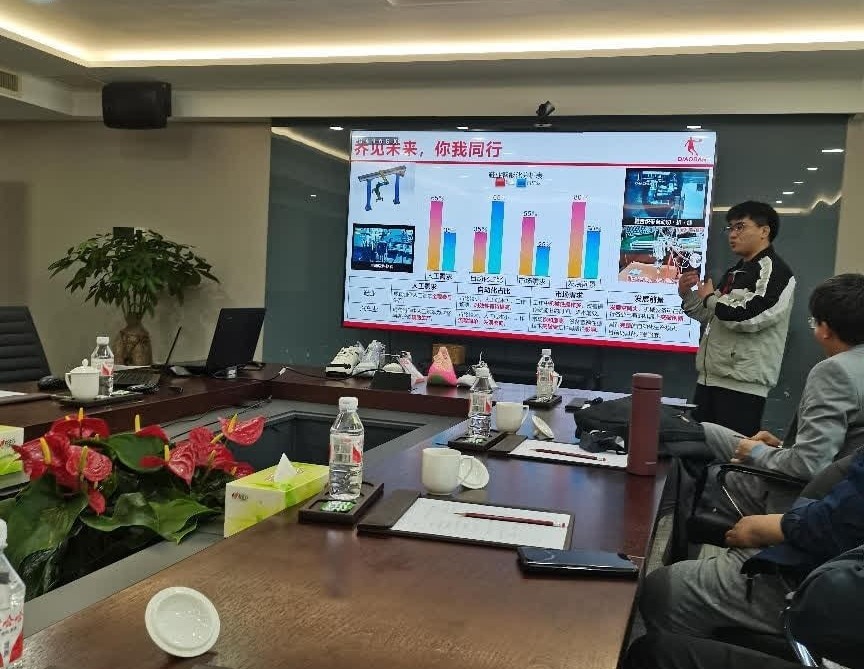 交流期间,双方围绕传统制鞋业智能化转型、自动化生产线升级及联合申报科技进步奖等议题展开深度交流。高浩院长带队深入中乔公司生产车间,针对全流程自动化产线优化和智能化检测与数据分析两个方向提出合作方案。通过共同研发适用于多品类鞋款生产的柔性制造系统,涵盖3D针织、智能缝纫、自动喷胶等环节,实现目标材料剪裁后全工序机器代工。引入AI视觉检测技术,结合现有检测机器人,构建鞋品质量动态监测平台,缩短检测周期,提升精准度。双方达成初步计划,将以“制鞋行业智能化关键技术与装备研发”主题,联合申报省级科技进步奖。