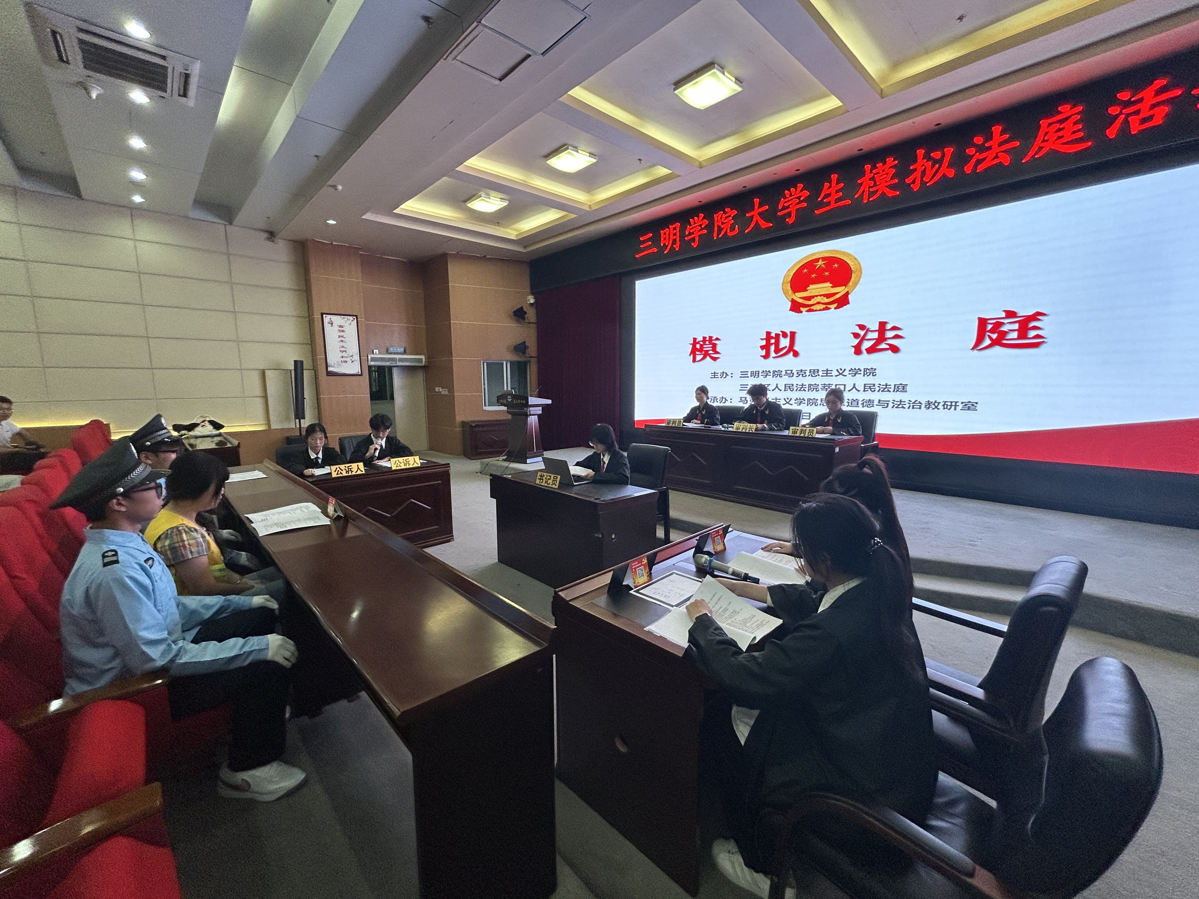 为进一步强化《思想道德与法治》课程教学效果,深入一站式学生社区加强学生法治教育,6月4日,由yl6809永利官网马克思主义学院、三元区人民法院莘口人民法庭主办,马克思主义学院思想道德与法治教研室承办的模拟法庭活动在yl6809永利官网图书馆学术报告厅顺利展开。莘口法庭庭长、一级法官张朝炼、莘口人民法庭四级法官助理卞晓激、马克思主义学院副院长徐桂兰教授、思想道德与法治教研室全体教师以及200多名学生参加活动。